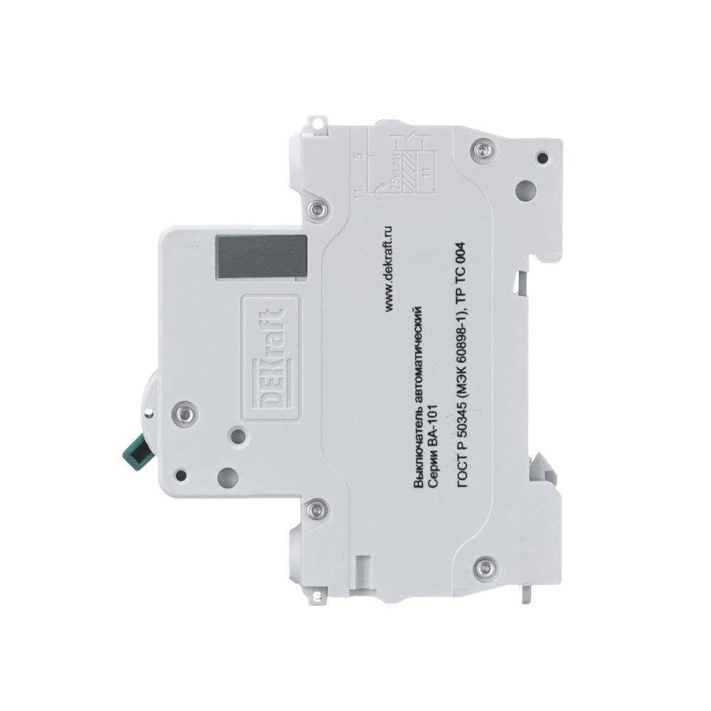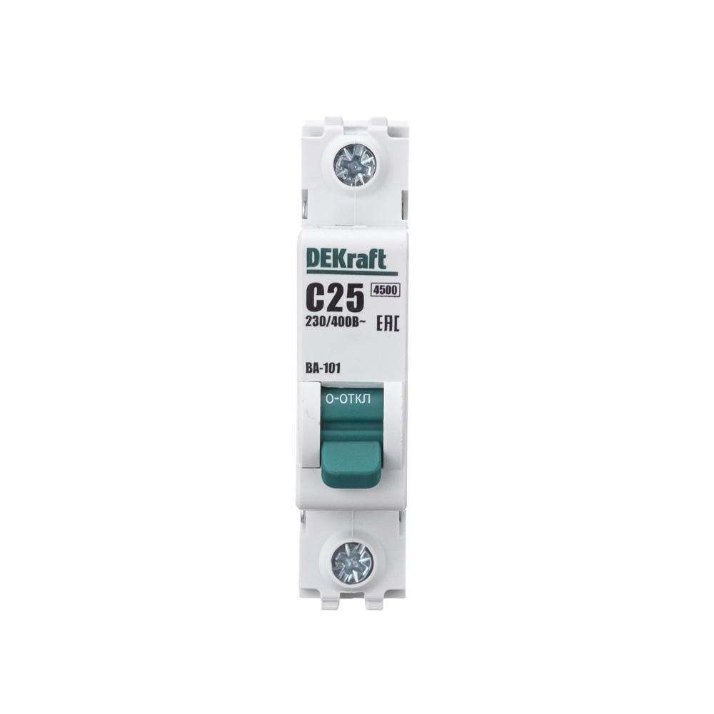 Автоматический выключатель серии ВА-101 DEKraft; 1P; номинальный ток 25 А; характеристика С; отключающая способность 4,5 кА. 5 монолитных заклепок повышают прочность корпуса аппарата. Сплошная лицевая панель обеспечивает безопасность эксплуатации аппарата. Боковые каналы охлаждения повышают стабильность работы при высоких температурах окружающей среды. Есть возможность установки дополнительных аксессуаров с левой стороны устройства. Аппарат на 100% совместим с корпусами DEKraft и Systeme Electric.