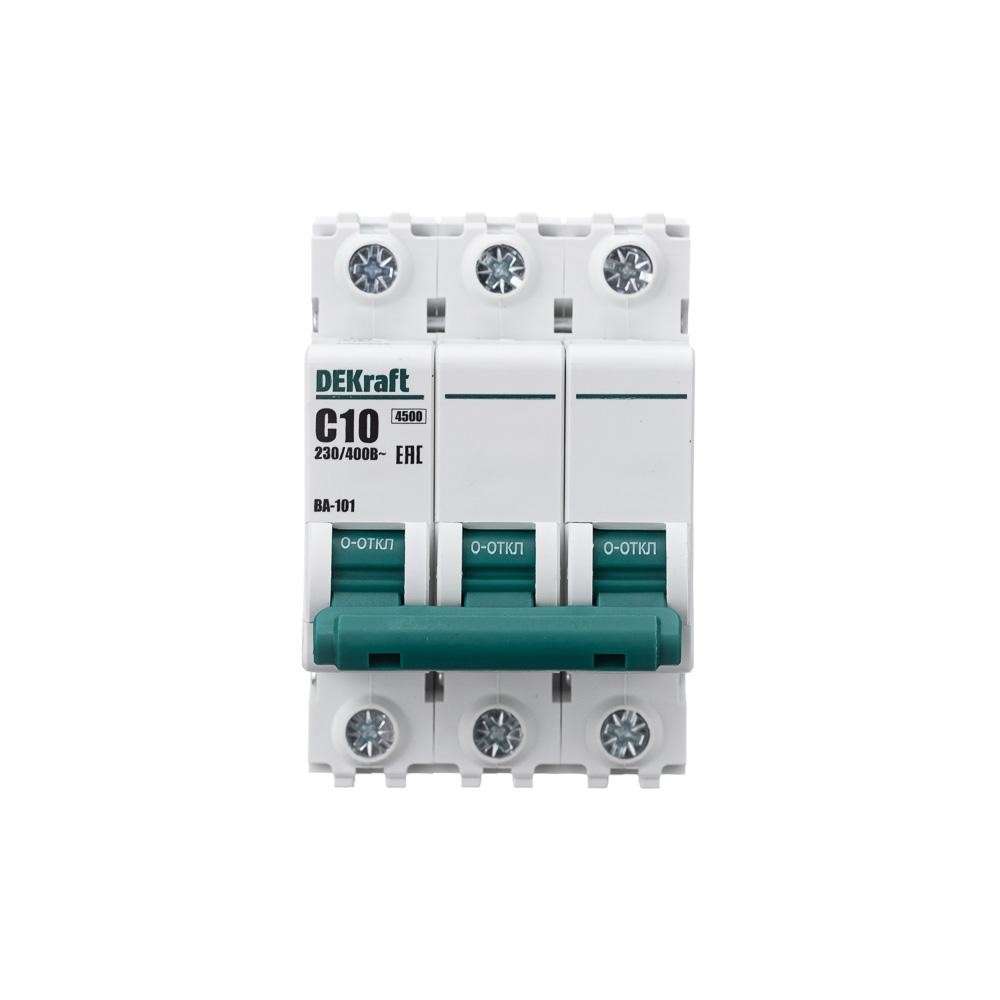 Автоматический выключатель серии ВА-101 DEKraft; 3P; номинальный ток 10 А; характеристика С; отключающая способность 4,5 кА. 5 монолитных заклепок повышают прочность корпуса аппарата. Сплошная лицевая панель обеспечивает безопасность эксплуатации аппарата. Боковые каналы охлаждения повышают стабильность работы при высоких температурах окружающей среды. Есть возможность установки дополнительных аксессуаров с левой стороны устройства. Аппарат на 100% совместим с корпусами DEKraft и Systeme Electric.