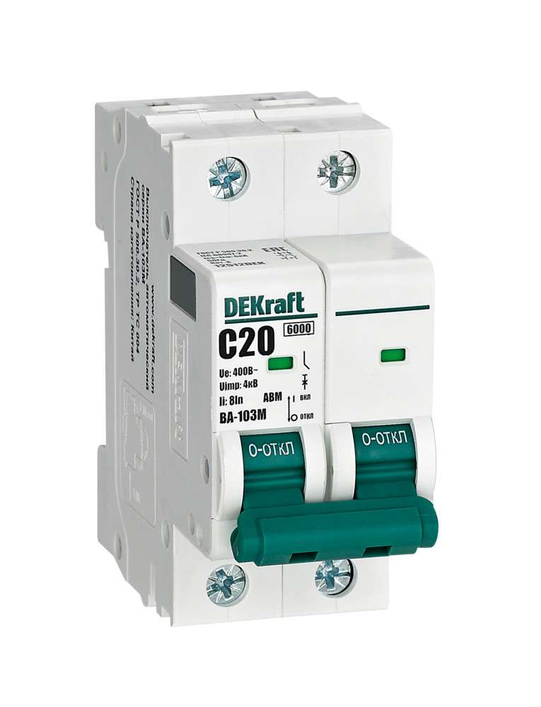 Автоматический выключатель без теплозащиты серии ВА-103M DEKraft; 2P; ном. ток 16 А; ном. раб. напряжение 400 В; кривая отключения C. Автоматические выключатели серии ВА-103М имеют специальное назначение для систем противопожарной защиты и вентиляции и выдерживают ток КЗ до 6000 А. Также они могут использоваться для нечастых оперативных включений и отключений указанных цепей. Автоматические выключатели соответствуют директиве RoHS, имеют расширенный диапазон рабочих температур от -25 до +60 °C, удобны и безопасны в эксплуатации.