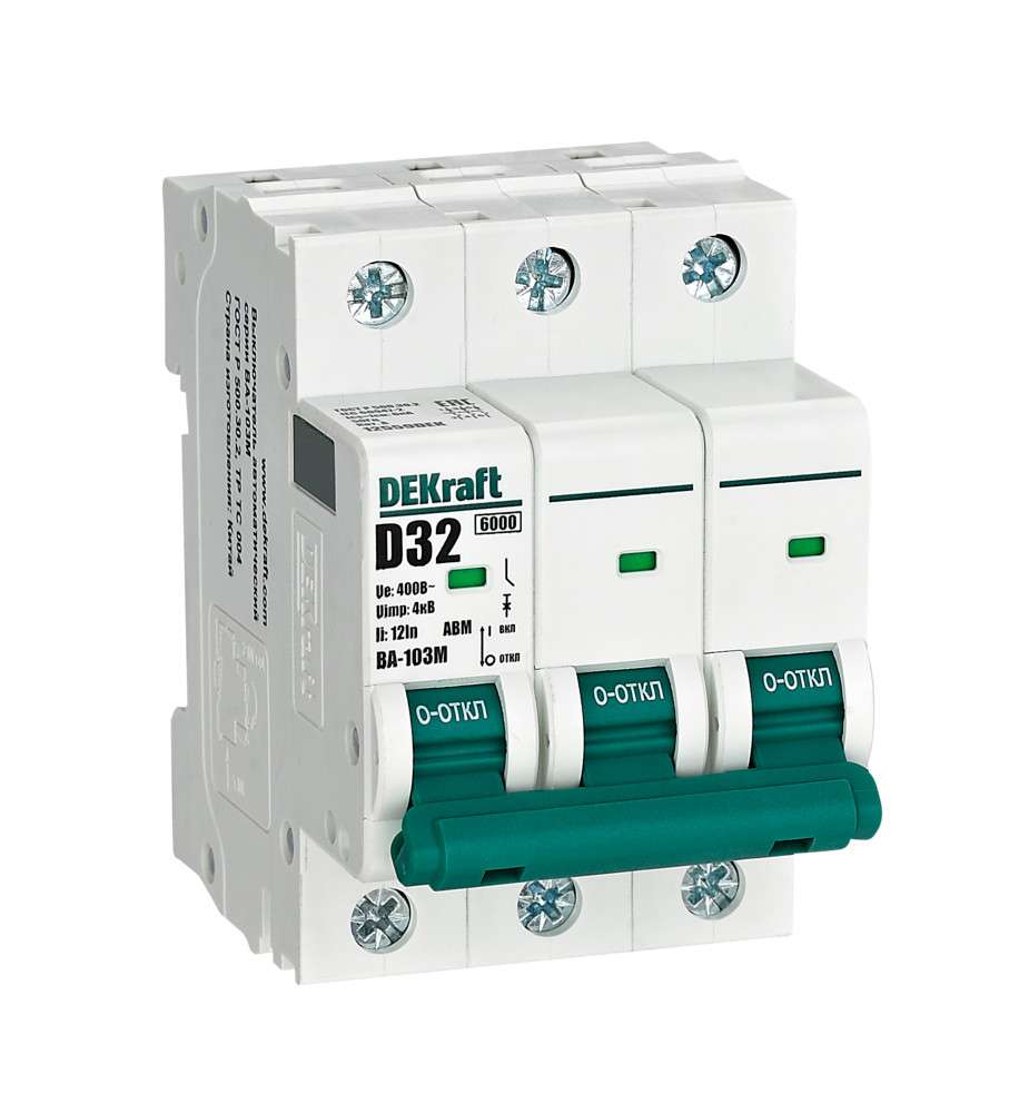 Автоматический выключатель без теплозащиты серии ВА-103M DEKraft; 3P; ном. ток 50 А; ном. раб. напряжение 400 В; кривая отключения D. Автоматические выключатели серии ВА-103М имеют специальное назначение для систем противопожарной защиты и вентиляции и выдерживают ток КЗ до 6000 А. Также они могут использоваться для нечастых оперативных включений и отключений указанных цепей. Автоматические выключатели соответствуют директиве RoHS, имеют расширенный диапазон рабочих температур от -25 до +60 °C, удобны и безопасны в эксплуатации.