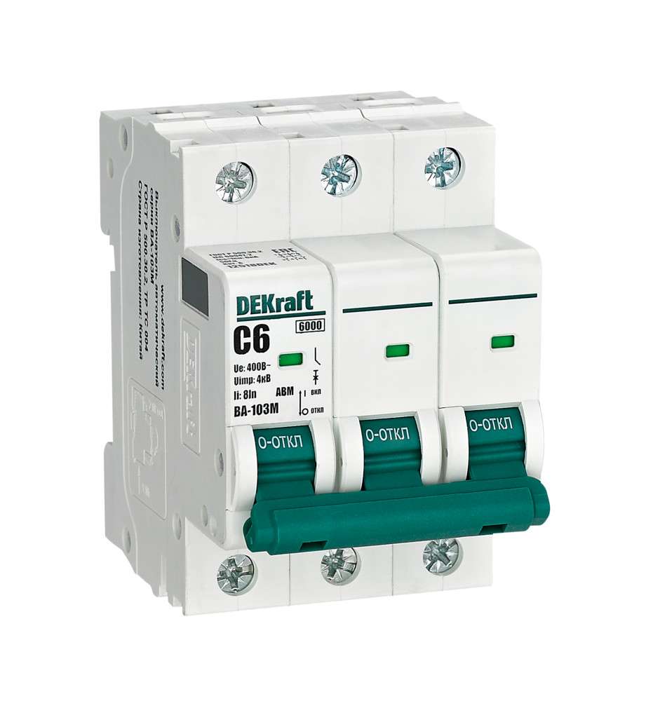 Автоматический выключатель без теплозащиты серии ВА-103M DEKraft; 3P; ном. ток 6 А; ном. раб. напряжение 400 В; кривая отключения C. Автоматические выключатели серии ВА-103М имеют специальное назначение для систем противопожарной защиты и вентиляции и выдерживают ток КЗ до 6000 А. Также они могут использоваться для нечастых оперативных включений и отключений указанных цепей. Автоматические выключатели соответствуют директиве RoHS, имеют расширенный диапазон рабочих температур от -25 до +60 °C, удобны и безопасны в эксплуатации.