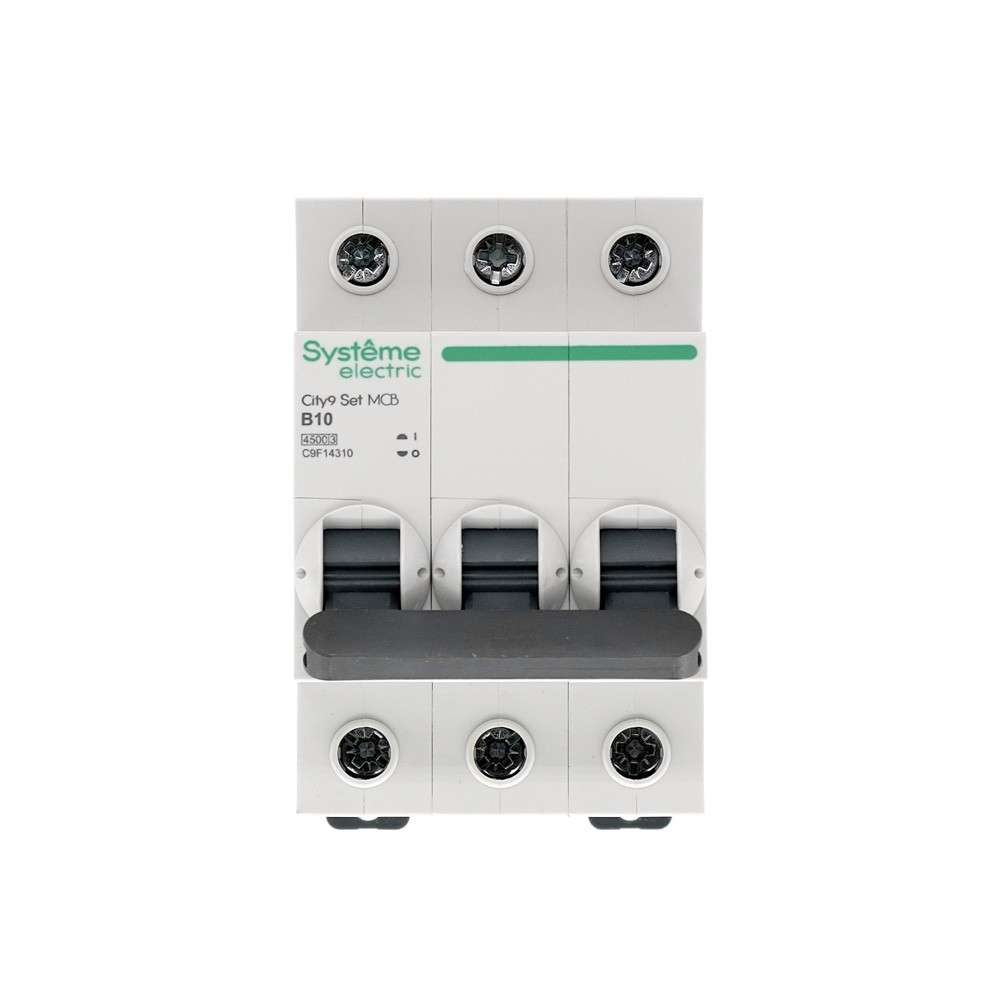 Автоматический выключатель серии City9 Set Systeme Electric, 3-полюсный, номинальный ток 10 А, характеристика B, Icn = 4.5 кА. Применяется в электрических сетях напряжением 400 В. Предназначен для защиты от перегрузок и токов короткого замыкания. Оснащен механизмом «мгновенной коммутации». Ударопрочный корпус из специального пластика с 6 металлическими заклепками. Безопасные клеммы исключают попадание кабелей в заклеммное пространство.