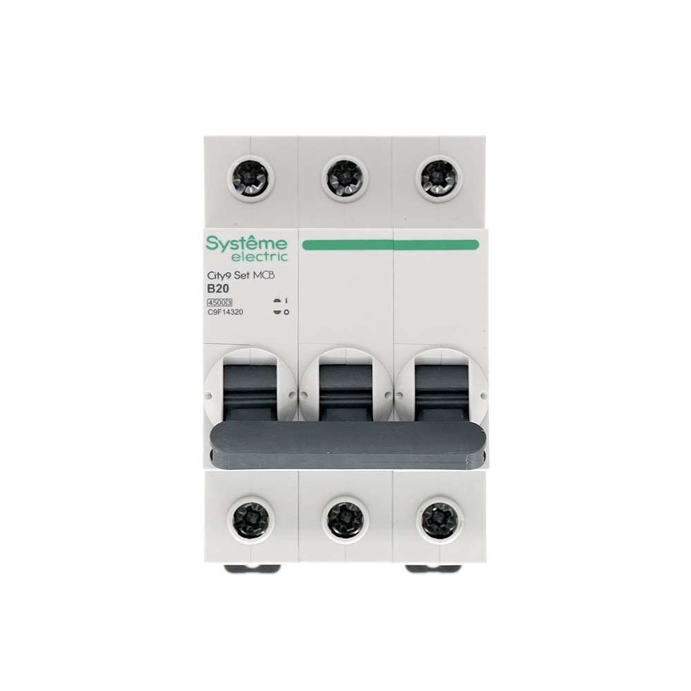 Автоматический выключатель серии City9 Set Systeme Electric, 3-полюсный, номинальный ток 20 А, характеристика B, Icn = 4.5 кА. Применяется в электрических сетях напряжением 400 В. Предназначен для защиты от перегрузок и токов короткого замыкания. Оснащен механизмом «мгновенной коммутации». Ударопрочный корпус из специального пластика с 6 металлическими заклепками. Безопасные клеммы исключают попадание кабелей в заклеммное пространство.