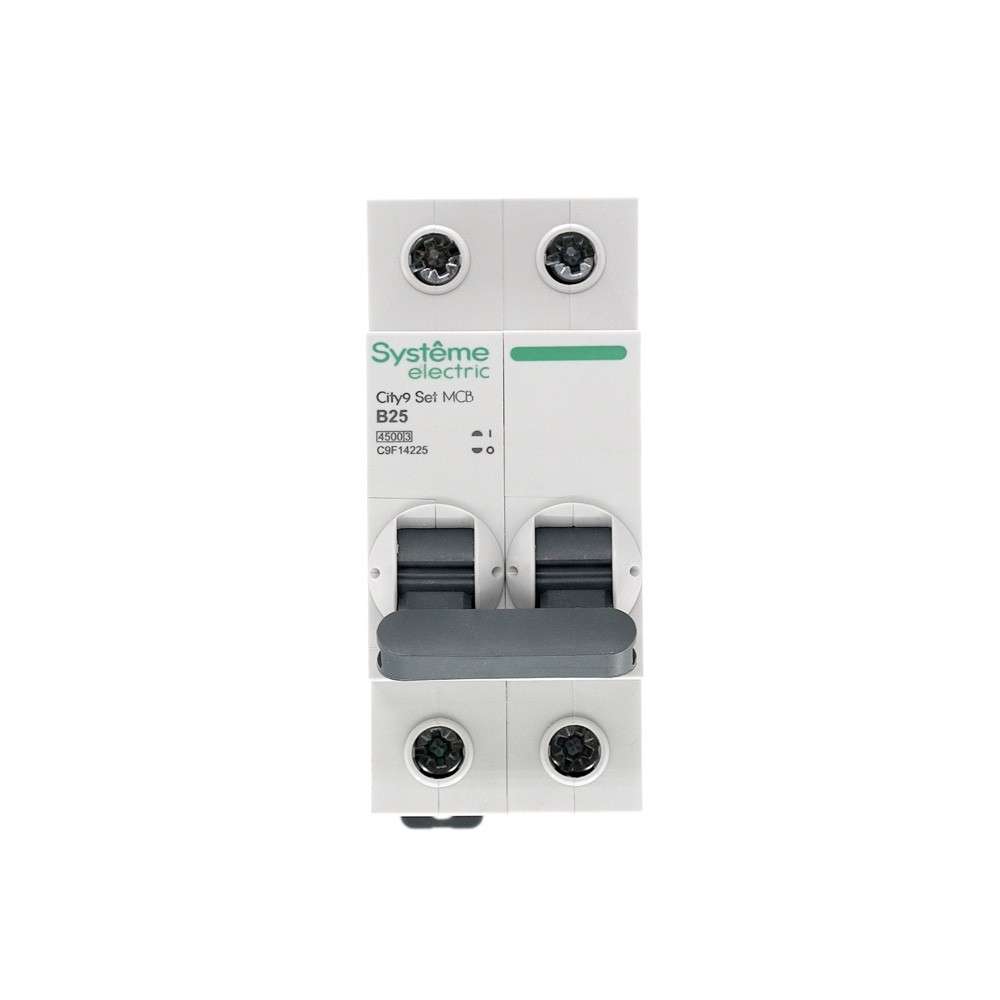 Автоматический выключатель серии City9 Set Systeme Electric, 2-полюсный, номинальный ток 25 А, характеристика B, Icn = 4.5 кА. Применяется в электрических сетях напряжением 230 В. Предназначен для защиты от перегрузок и токов короткого замыкания. Оснащен механизмом «мгновенной коммутации». Ударопрочный корпус из специального пластика с 6 металлическими заклепками. Безопасные клеммы исключают попадание кабелей в заклеммное пространство.