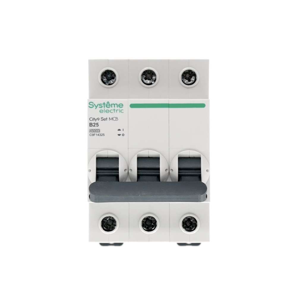 Автоматический выключатель серии City9 Set Systeme Electric, 3-полюсный, номинальный ток 25 А, характеристика B, Icn = 4.5 кА. Применяется в электрических сетях напряжением 400 В. Предназначен для защиты от перегрузок и токов короткого замыкания. Оснащен механизмом «мгновенной коммутации». Ударопрочный корпус из специального пластика с 6 металлическими заклепками. Безопасные клеммы исключают попадание кабелей в заклеммное пространство.