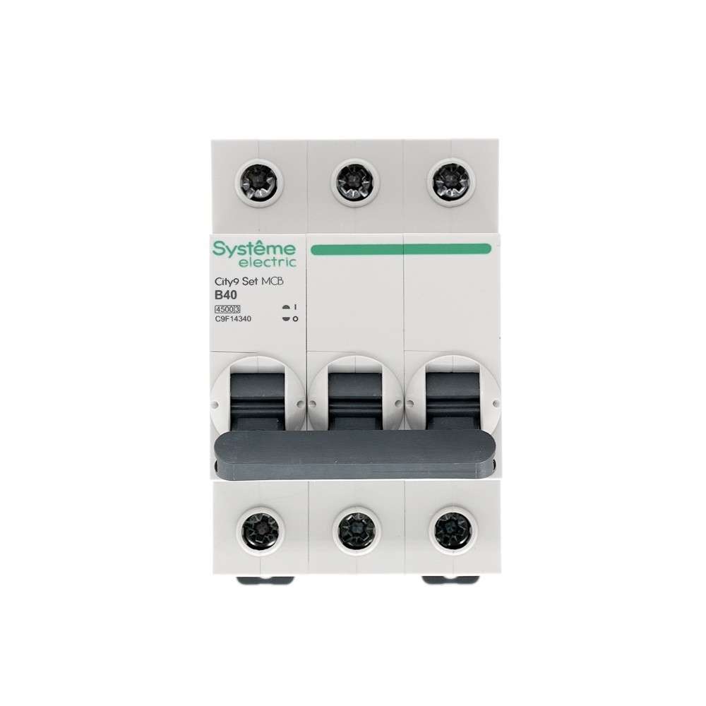 Автоматический выключатель серии City9 Set Systeme Electric, 3-полюсный, номинальный ток 40 А, характеристика B, Icn = 4.5 кА. Применяется в электрических сетях напряжением 400 В. Предназначен для защиты от перегрузок и токов короткого замыкания. Оснащен механизмом «мгновенной коммутации». Ударопрочный корпус из специального пластика с 6 металлическими заклепками. Безопасные клеммы исключают попадание кабелей в заклеммное пространство.