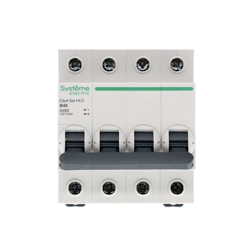 Автоматический выключатель серии City9 Set Systeme Electric, 4-полюсный, номинальный ток 40 А, характеристика B, Icn = 4.5 кА. Применяется в электрических сетях напряжением 400 В. Предназначен для защиты от перегрузок и токов короткого замыкания. Оснащен механизмом «мгновенной коммутации». Ударопрочный корпус из специального пластика с 6 металлическими заклепками. Безопасные клеммы исключают попадание кабелей в заклеммное пространство.