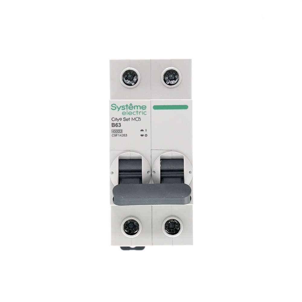 Автоматический выключатель серии City9 Set Systeme Electric, 2-полюсный, номинальный ток 63 А, характеристика B, Icn = 4.5 кА. Применяется в электрических сетях напряжением 230 В. Предназначен для защиты от перегрузок и токов короткого замыкания. Оснащен механизмом «мгновенной коммутации». Ударопрочный корпус из специального пластика с 6 металлическими заклепками. Безопасные клеммы исключают попадание кабелей в заклеммное пространство.