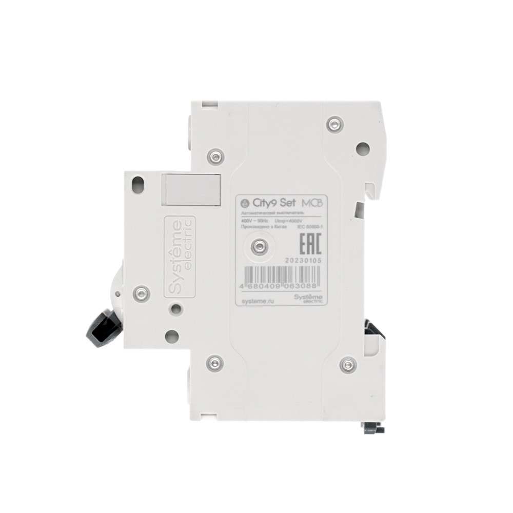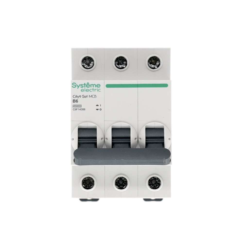 Автоматический выключатель серии City9 Set Systeme Electric, 3-полюсный, номинальный ток 6 А, характеристика B, Icn = 4.5 кА. Применяется в электрических сетях напряжением 400 В. Предназначен для защиты от перегрузок и токов короткого замыкания. Оснащен механизмом «мгновенной коммутации». Ударопрочный корпус из специального пластика с 6 металлическими заклепками. Безопасные клеммы исключают попадание кабелей в заклеммное пространство.