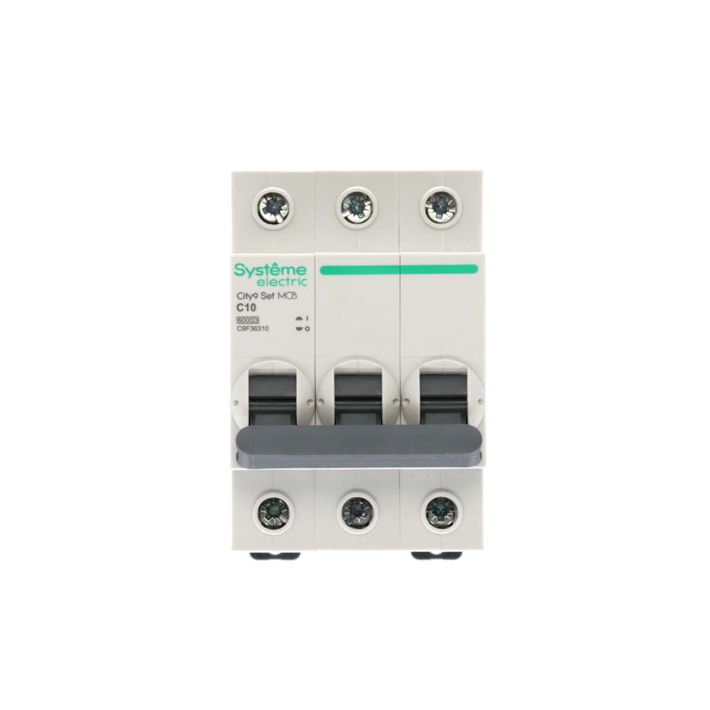 Автоматический выключатель серии City9 Set Systeme Electric, 3-полюсный, номинальный ток 10 А, характеристика С, Icn = 6 кА. Применяется в электрических сетях напряжением 400 В. Предназначен для защиты от перегрузок и токов короткого замыкания. Оснащен механизмом «мгновенной коммутации». Ударопрочный корпус из специального пластика с 6 металлическими заклепками. Безопасные клеммы исключают попадание кабелей в заклеммное пространство.