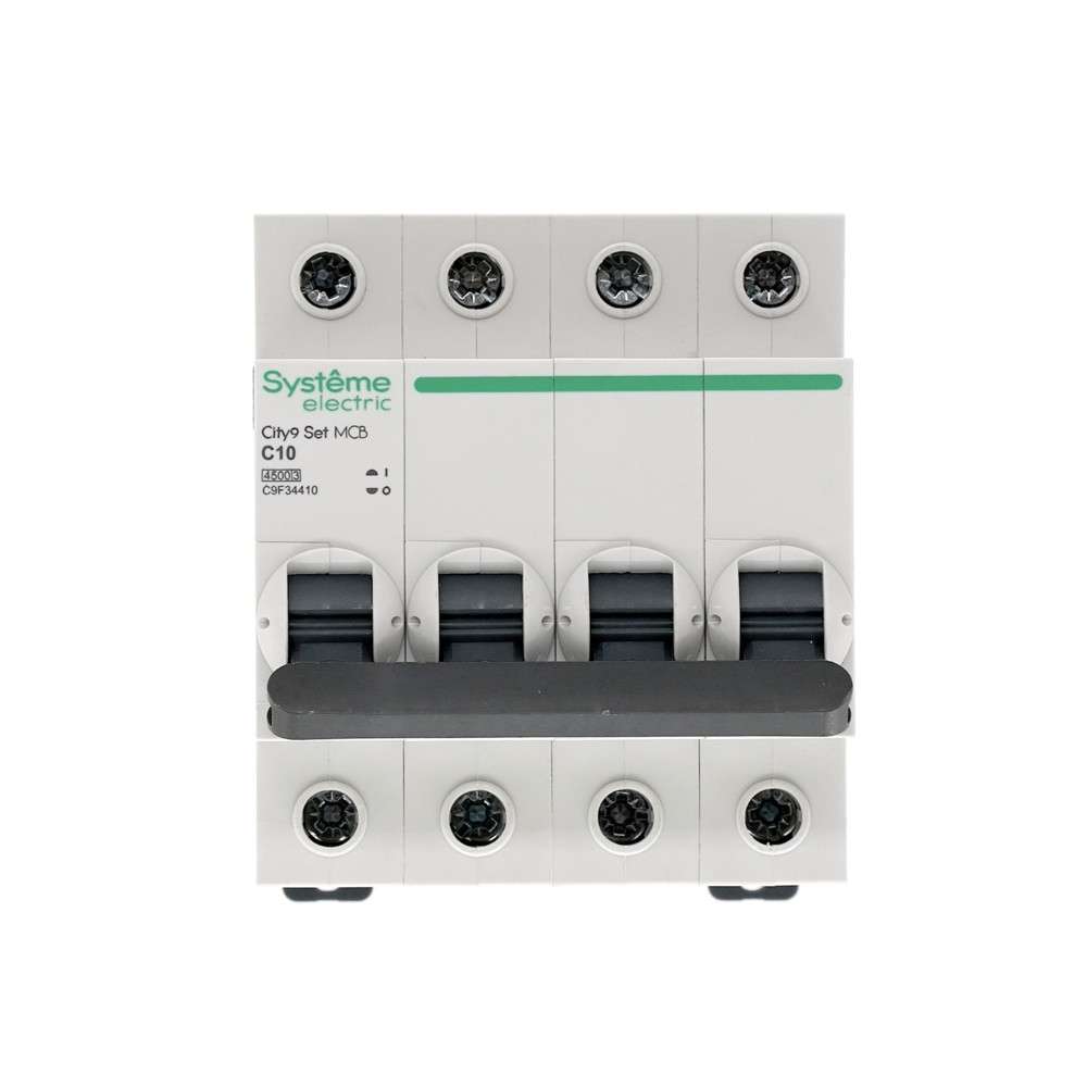 Автоматический выключатель серии City9 Set Systeme Electric, 4-полюсный, номинальный ток 10 А, характеристика С, Icn = 4.5 кА. Применяется в электрических сетях напряжением 400 В. Предназначен для защиты от перегрузок и токов короткого замыкания. Оснащен механизмом «мгновенной коммутации». Ударопрочный корпус из специального пластика с 6 металлическими заклепками. Безопасные клеммы исключают попадание кабелей в заклеммное пространство.