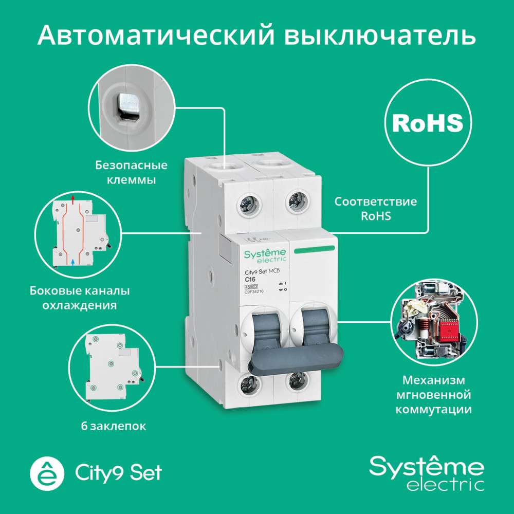 Автоматический выключатель серии City9 Set Systeme Electric, 2-полюсный, номинальный ток 16 А, характеристика С, Icn = 4.5 кА. Применяется в электрических сетях напряжением 230 В. Предназначен для защиты от перегрузок и токов короткого замыкания. Оснащен механизмом «мгновенной коммутации». Ударопрочный корпус из специального пластика с 6 металлическими заклепками. Безопасные клеммы исключают попадание кабелей в заклеммное пространство.