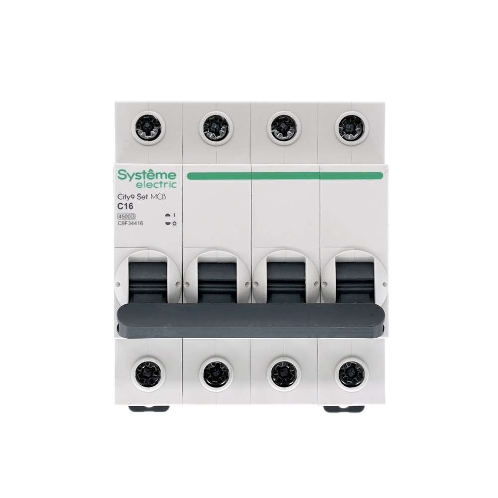 Автоматический выключатель серии City9 Set Systeme Electric, 4-полюсный, номинальный ток 16 А, характеристика С, Icn = 4.5 кА. Применяется в электрических сетях напряжением 400 В. Предназначен для защиты от перегрузок и токов короткого замыкания. Оснащен механизмом «мгновенной коммутации». Ударопрочный корпус из специального пластика с 6 металлическими заклепками. Безопасные клеммы исключают попадание кабелей в заклеммное пространство.