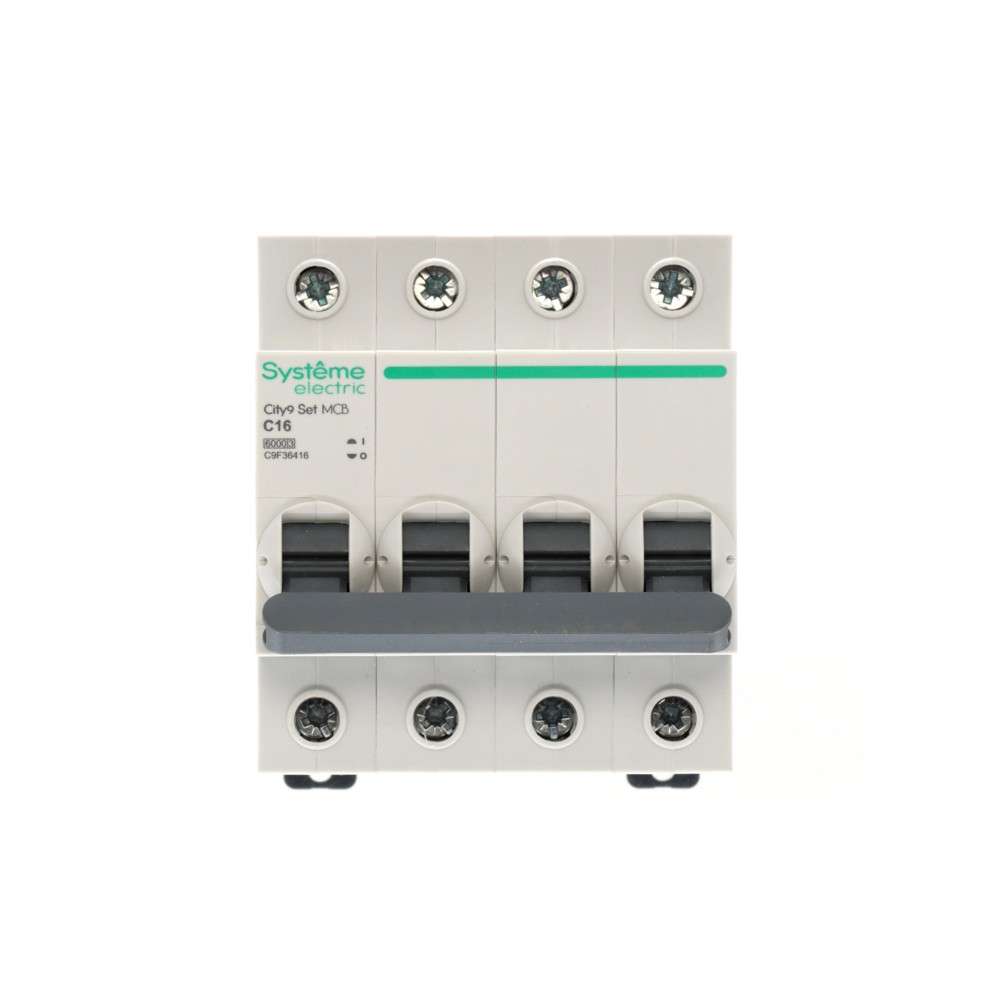 Автоматический выключатель серии City9 Set Systeme Electric, 4-полюсный, номинальный ток 16 А, характеристика С, Icn = 6 кА. Применяется в электрических сетях напряжением 400 В. Предназначен для защиты от перегрузок и токов короткого замыкания. Оснащен механизмом «мгновенной коммутации». Ударопрочный корпус из специального пластика с 6 металлическими заклепками. Безопасные клеммы исключают попадание кабелей в заклеммное пространство.
