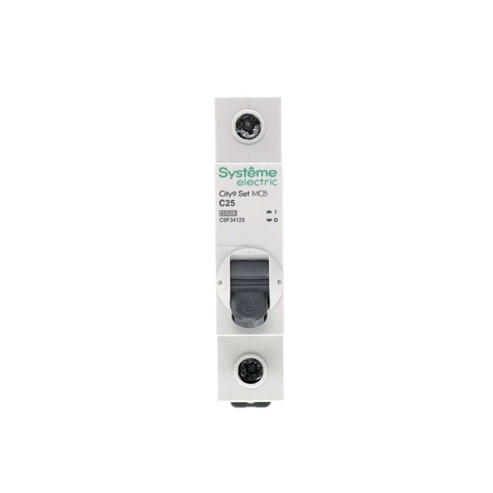 Автоматический выключатель серии City9 Set Systeme Electric, 1-полюсный, номинальный ток 25 А, характеристика С, Icn = 4.5 кА. Применяется в электрических сетях напряжением 230 В. Предназначен для защиты от перегрузок и токов короткого замыкания. Оснащен механизмом «мгновенной коммутации». Ударопрочный корпус из специального пластика с 6 металлическими заклепками. Безопасные клеммы исключают попадание кабелей в заклеммное пространство.