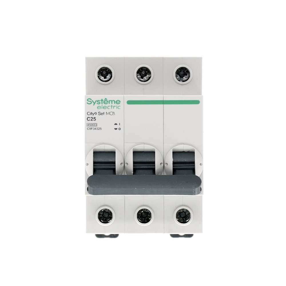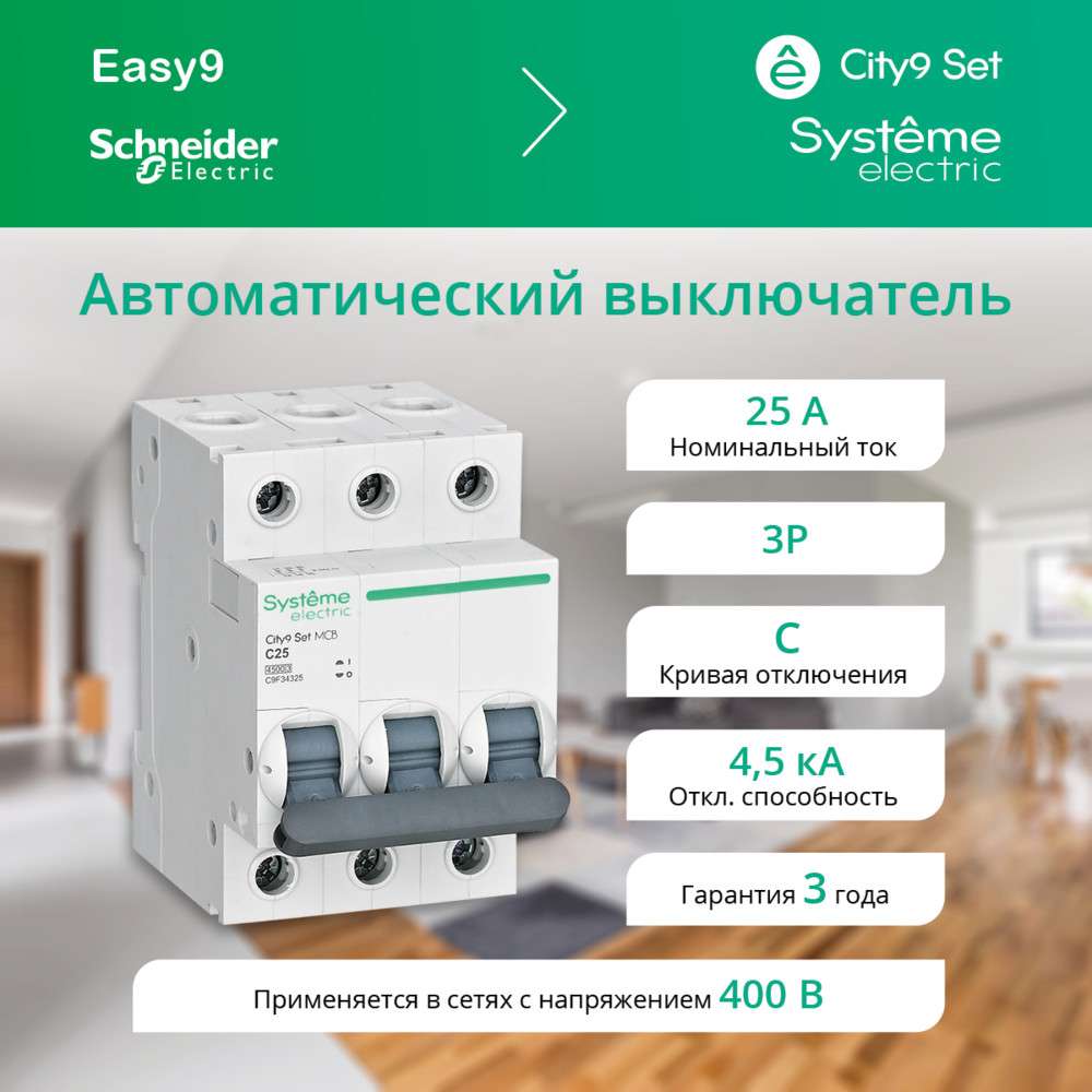 Автоматический выключатель серии City9 Set Systeme Electric, 3-полюсный, номинальный ток 25 А, характеристика С, Icn = 4.5 кА. Применяется в электрических сетях напряжением 400 В. Предназначен для защиты от перегрузок и токов короткого замыкания. Оснащен механизмом «мгновенной коммутации». Ударопрочный корпус из специального пластика с 6 металлическими заклепками. Безопасные клеммы исключают попадание кабелей в заклеммное пространство.