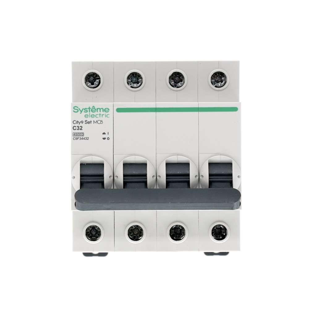 Автоматический выключатель серии City9 Set Systeme Electric, 4-полюсный, номинальный ток 32 А, характеристика С, Icn = 4.5 кА. Применяется в электрических сетях напряжением 400 В. Предназначен для защиты от перегрузок и токов короткого замыкания. Оснащен механизмом «мгновенной коммутации». Ударопрочный корпус из специального пластика с 6 металлическими заклепками. Безопасные клеммы исключают попадание кабелей в заклеммное пространство.