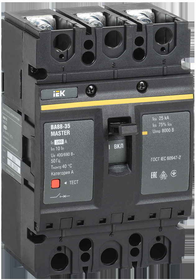 Автоматический выключатель в литом корпусе ВА88 MASTER предназначен для защиты электрических сетей от токов короткого замыкания, токов перегрузки, недопустимых снижений напряжения, а также для проведения тока в нормальном режиме. Автоматические выключатели производятся в 5 типоразмерах, оснащены термомагнитным расцепителем на токи от 16 до 800А и электронным расцепителем на токи от 125 до 800А. Рабочее напряжение 400/690 В. Конструкция автоматического выключателя предусматривает возможность самостоятельной установки дополнительных устройств на объекте заказчика.