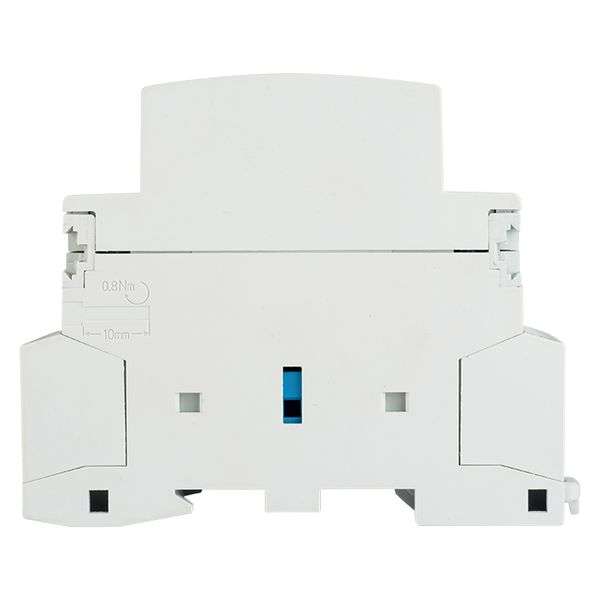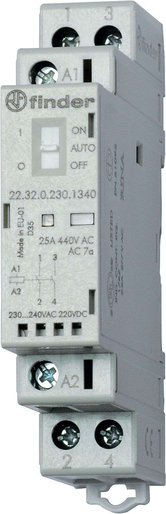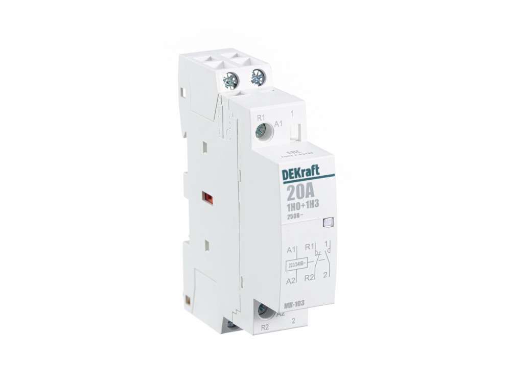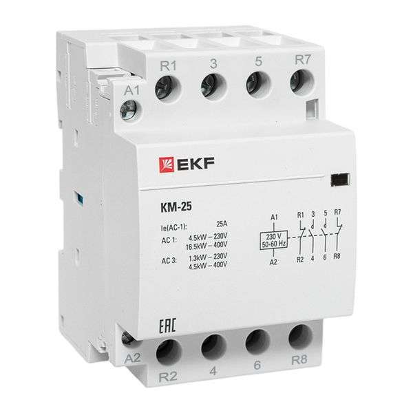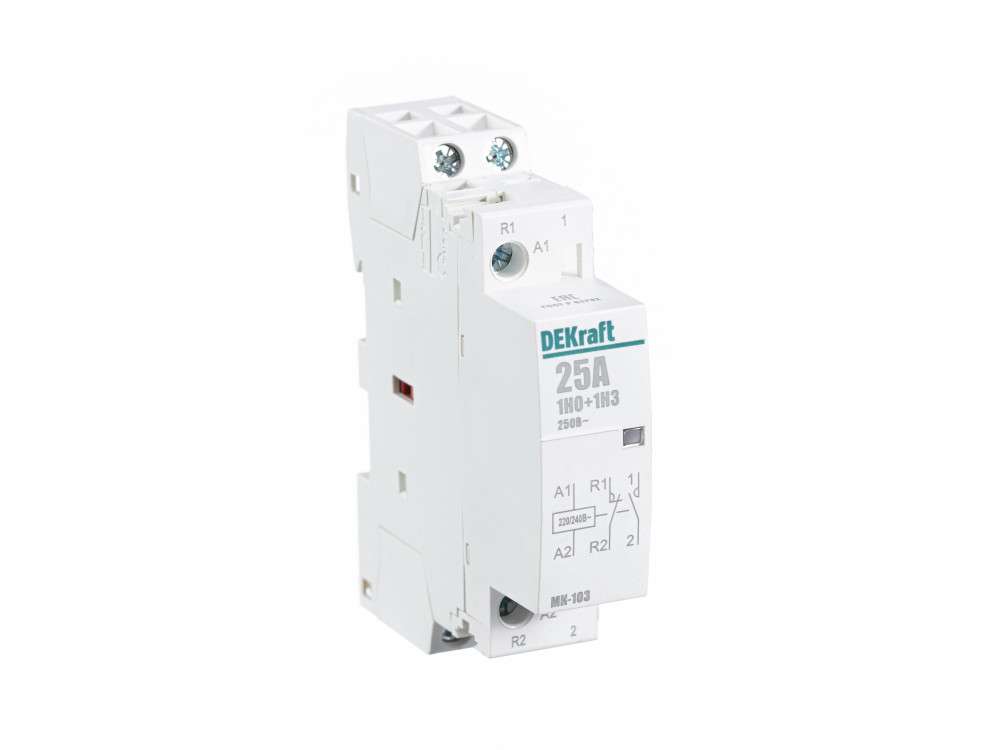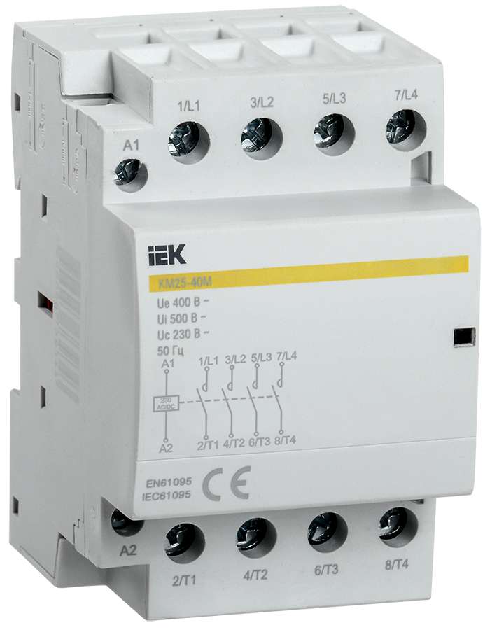 Модульные контакторы представляют из себя контактор в классическом корпусе модульного оборудования. Он состоит из неподвижных контактов, подвижных контактов, которые закреплены в подвижной части магнитной системы. Неподвижная часть магнитной системы закреплена жестко в корпусе КМ. Пружина препятствует смыканию контактов. При подаче напряжения на катушку управления в магнитной системе контактора возникает магнитное поле, которое, преодолевая сопротивление пружины, смыкает магнитную систему и замыкает контакты. При отключении напряжения с катушки управления пружина размыкает контакты. Возможна коммутация алюминиевым и медным проводом.