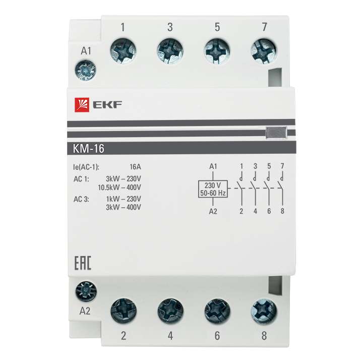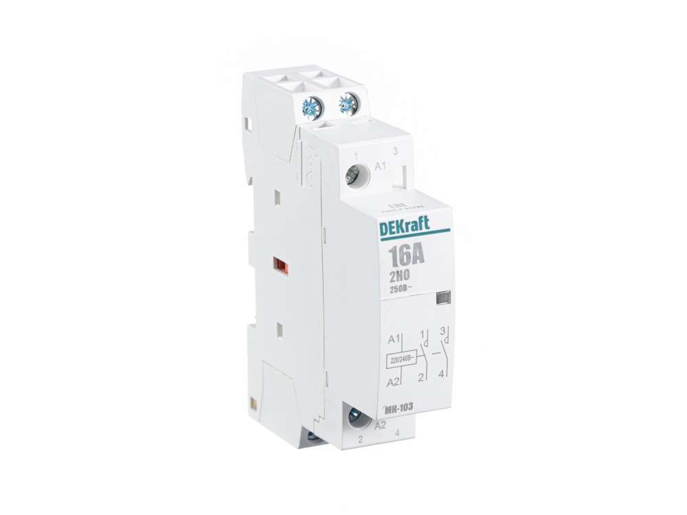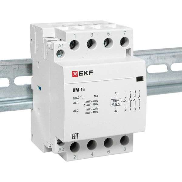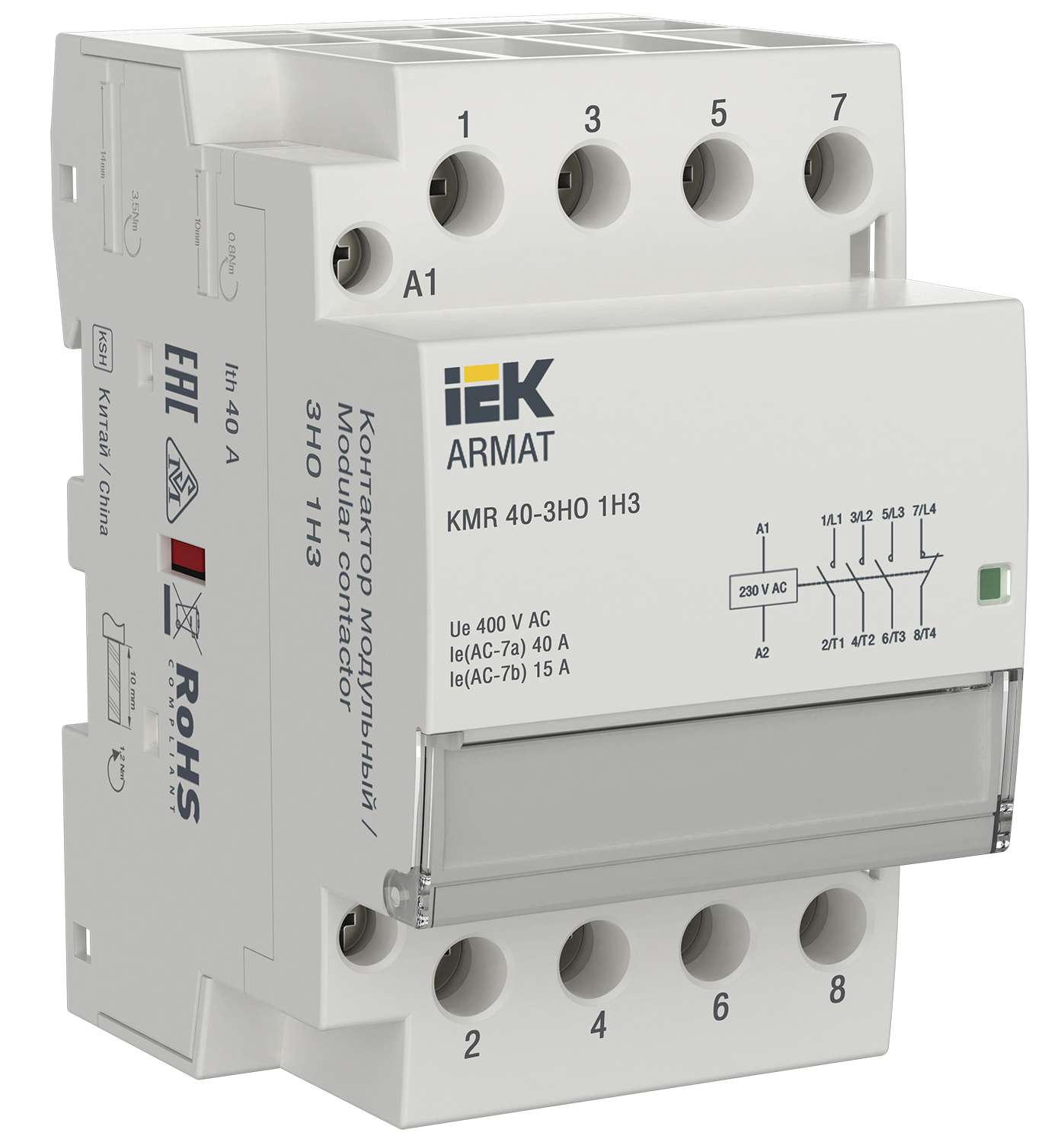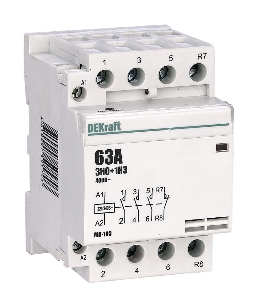 Модульные контакторы представляют из себя контактор в классическом корпусе модульного оборудования. Он состоит из неподвижных контактов, подвижных контактов, которые закреплены в подвижной части магнитной системы. Неподвижная часть магнитной системы закреплена жестко в корпусе КМ. Пружина препятствует смыканию контактов. При подаче напряжения на катушку управления в магнитной системе контактора возникает магнитное поле, которое, преодолевая сопротивление пружины, смыкает магнитную систему и замыкает контакты. При отключении напряжения с катушки управления пружина размыкает контакты. Возможна коммутация алюминиевым и медным проводом.