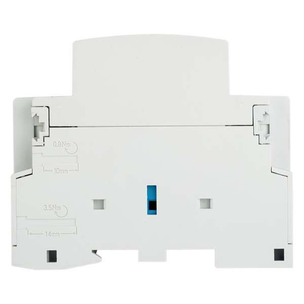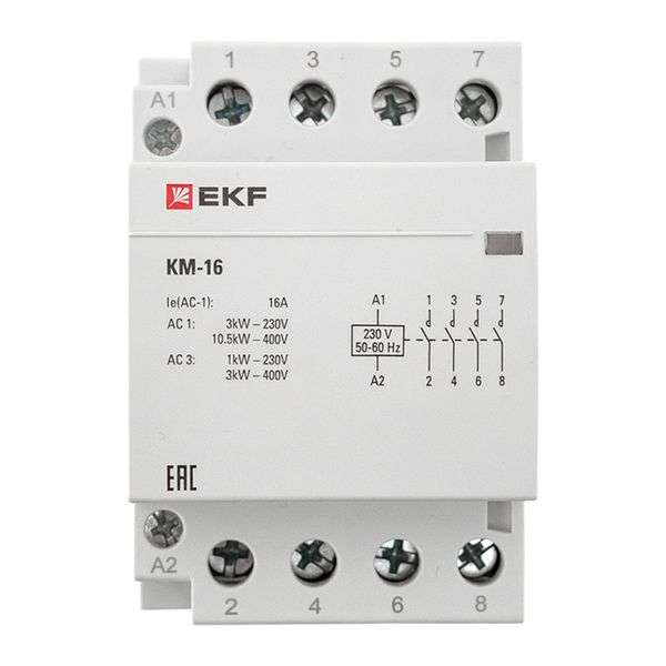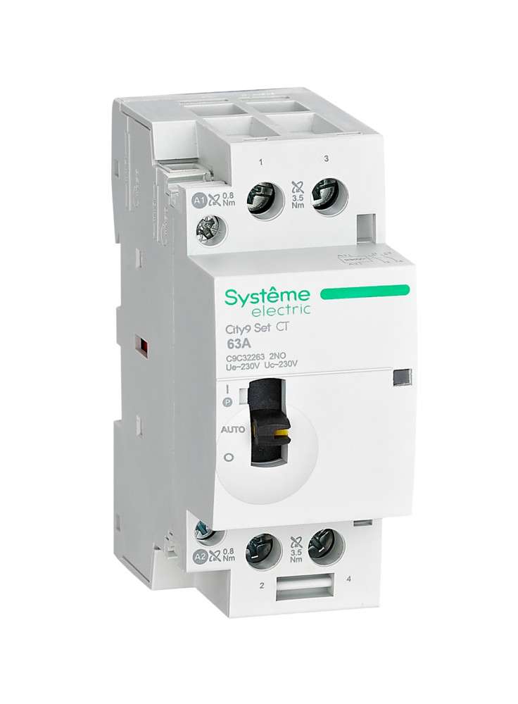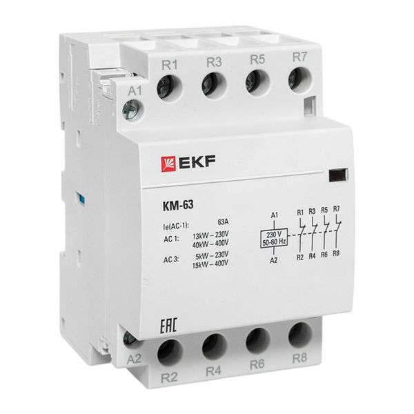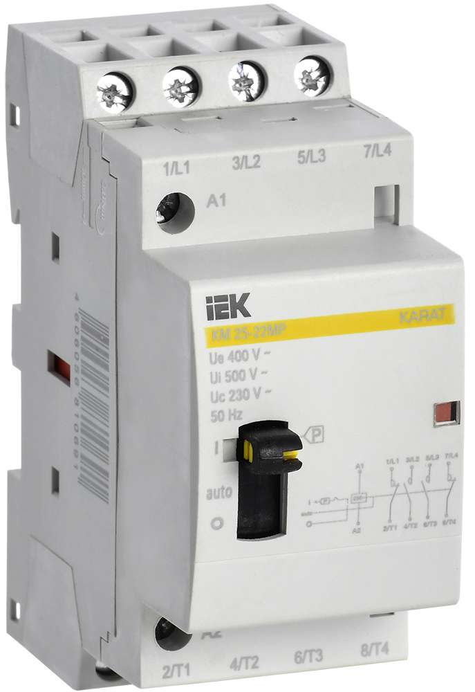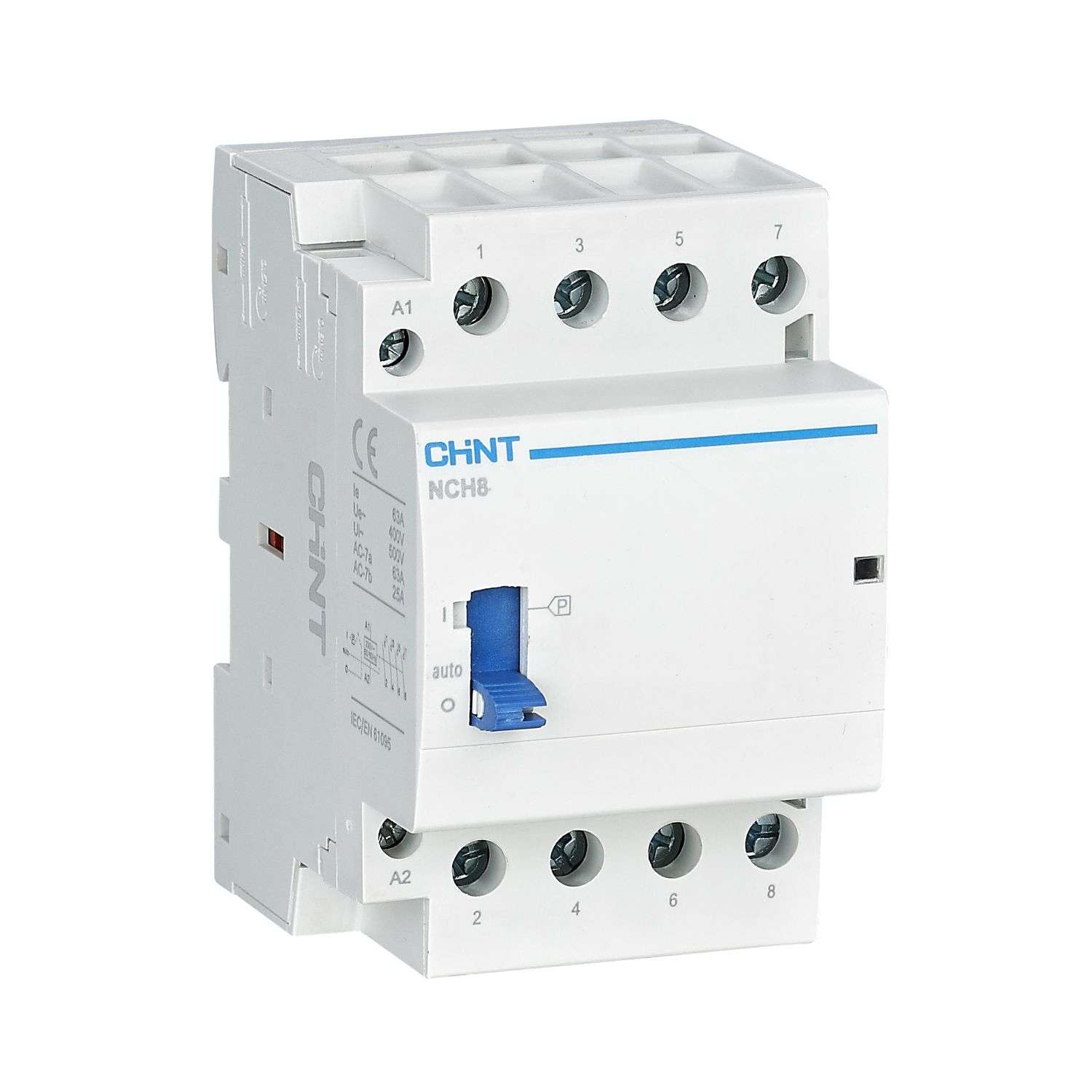 Модульные контакторы представляют из себя контактор в классическом корпусе модульного оборудования. Он состоит из неподвижных контактов, подвижных контактов, которые закреплены в подвижной части магнитной системы. Неподвижная часть магнитной системы закреплена жестко в корпусе КМ. Пружина препятствует смыканию контактов. При подаче напряжения на катушку управления в магнитной системе контактора возникает магнитное поле, которое, преодолевая сопротивление пружины, смыкает магнитную систему и замыкает контакты. При отключении напряжения с катушки управления пружина размыкает контакты. Возможна коммутация алюминиевым и медным проводом.