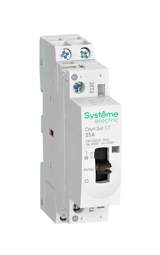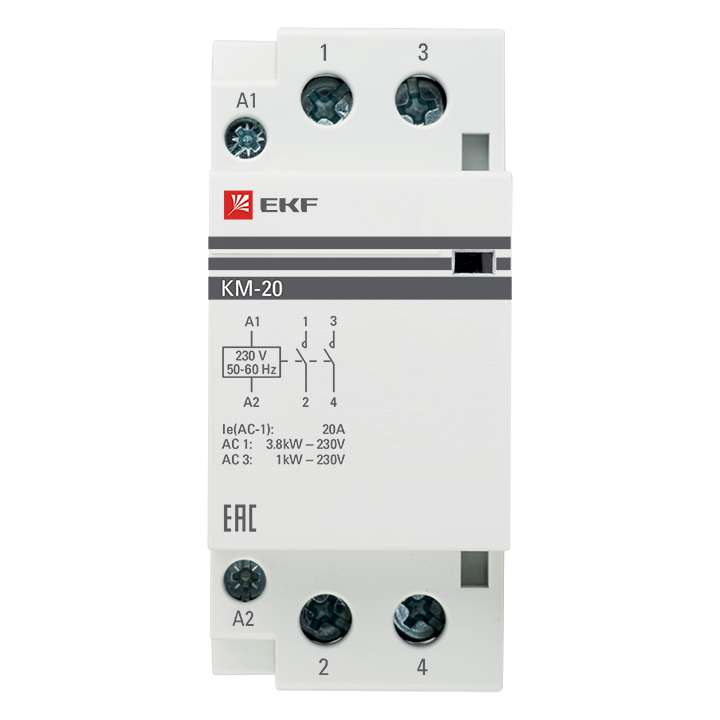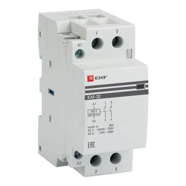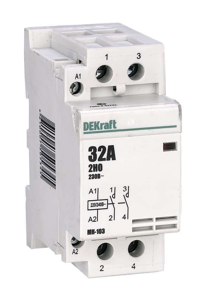 Модульные контакторы представляют из себя контактор в классическом корпусе модульного оборудования. Он состоит из неподвижных контактов, подвижных контактов, которые закреплены в подвижной части магнитной системы. Неподвижная часть магнитной системы закреплена жестко в корпусе КМ. Пружина препятствует смыканию контактов. При подаче напряжения на катушку управления в магнитной системе контактора возникает магнитное поле, которое, преодолевая сопротивление пружины, смыкает магнитную систему и замыкает контакты. При отключении напряжения с катушки управления пружина размыкает контакты. Возможна коммутация алюминиевым и медным проводом.