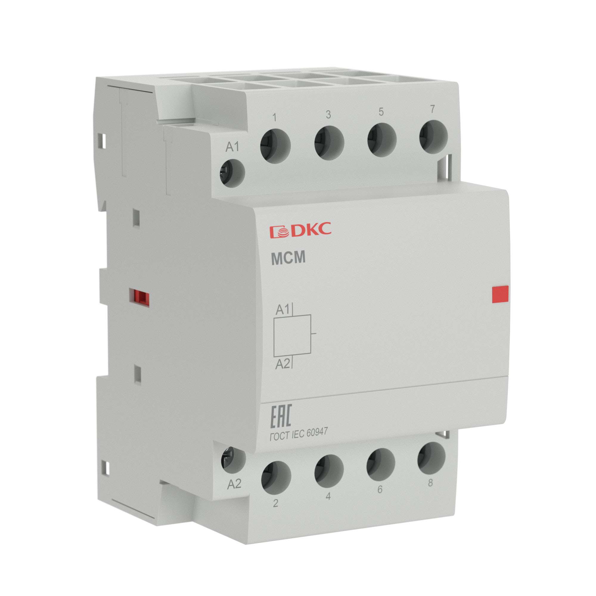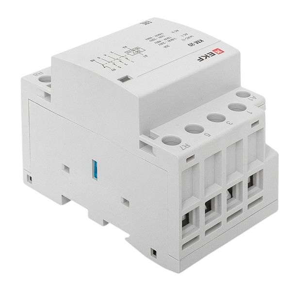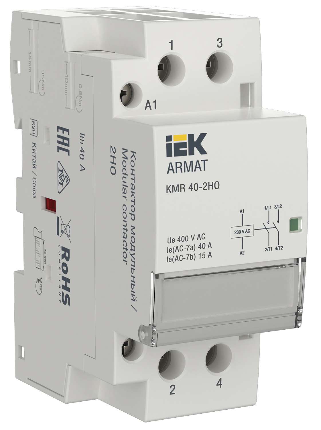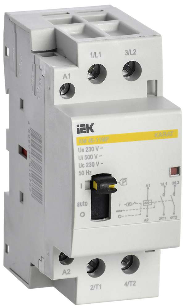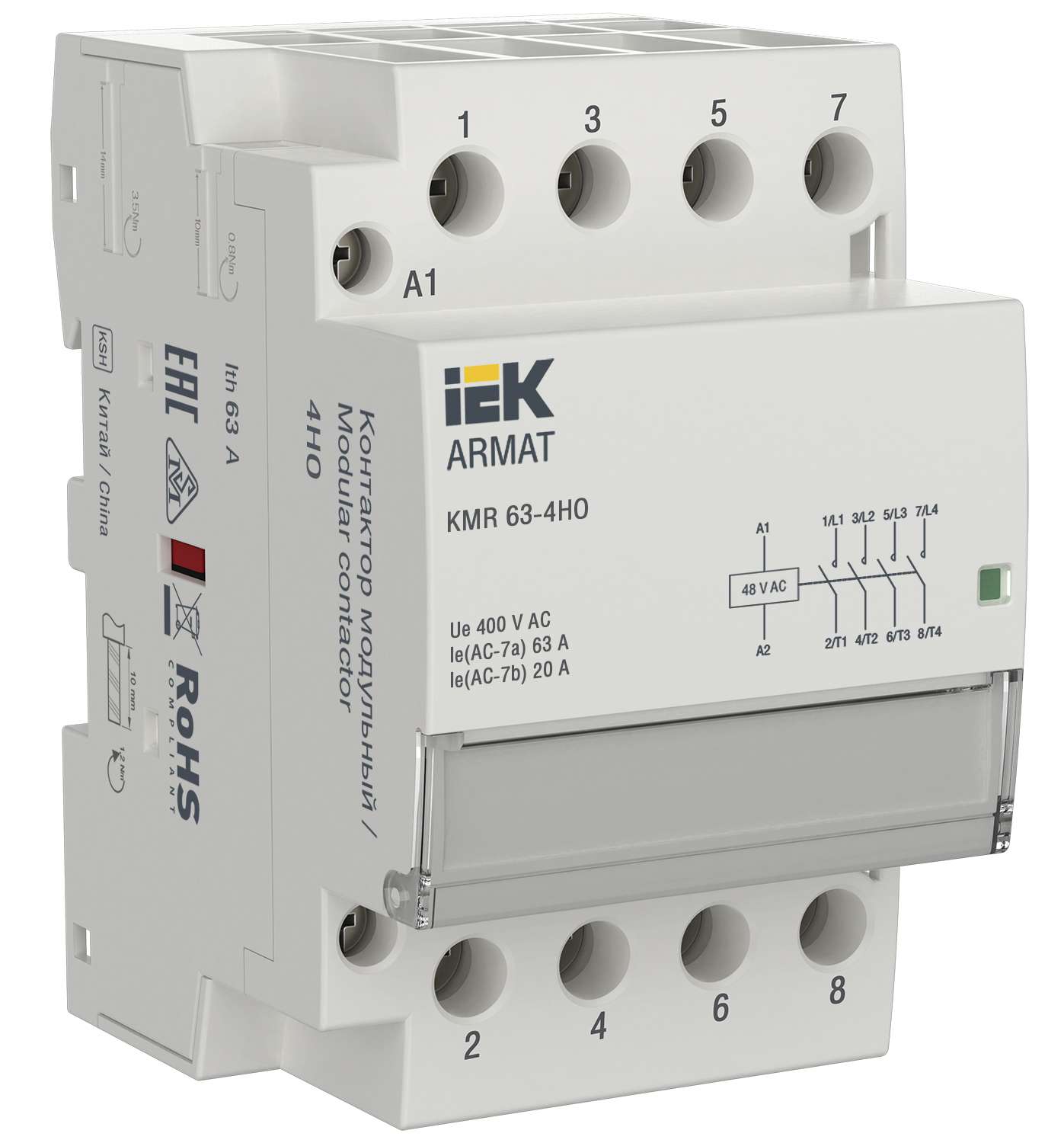 Модульные контакторы представляют из себя контактор в классическом корпусе модульного оборудования. Он состоит из неподвижных контактов, подвижных контактов, которые закреплены в подвижной части магнитной системы. Неподвижная часть магнитной системы закреплена жестко в корпусе КМ. Пружина препятствует смыканию контактов. При подаче напряжения на катушку управления в магнитной системе контактора возникает магнитное поле, которое, преодолевая сопротивление пружины, смыкает магнитную систему и замыкает контакты. При отключении напряжения с катушки управления пружина размыкает контакты. Возможна коммутация алюминиевым и медным проводом.