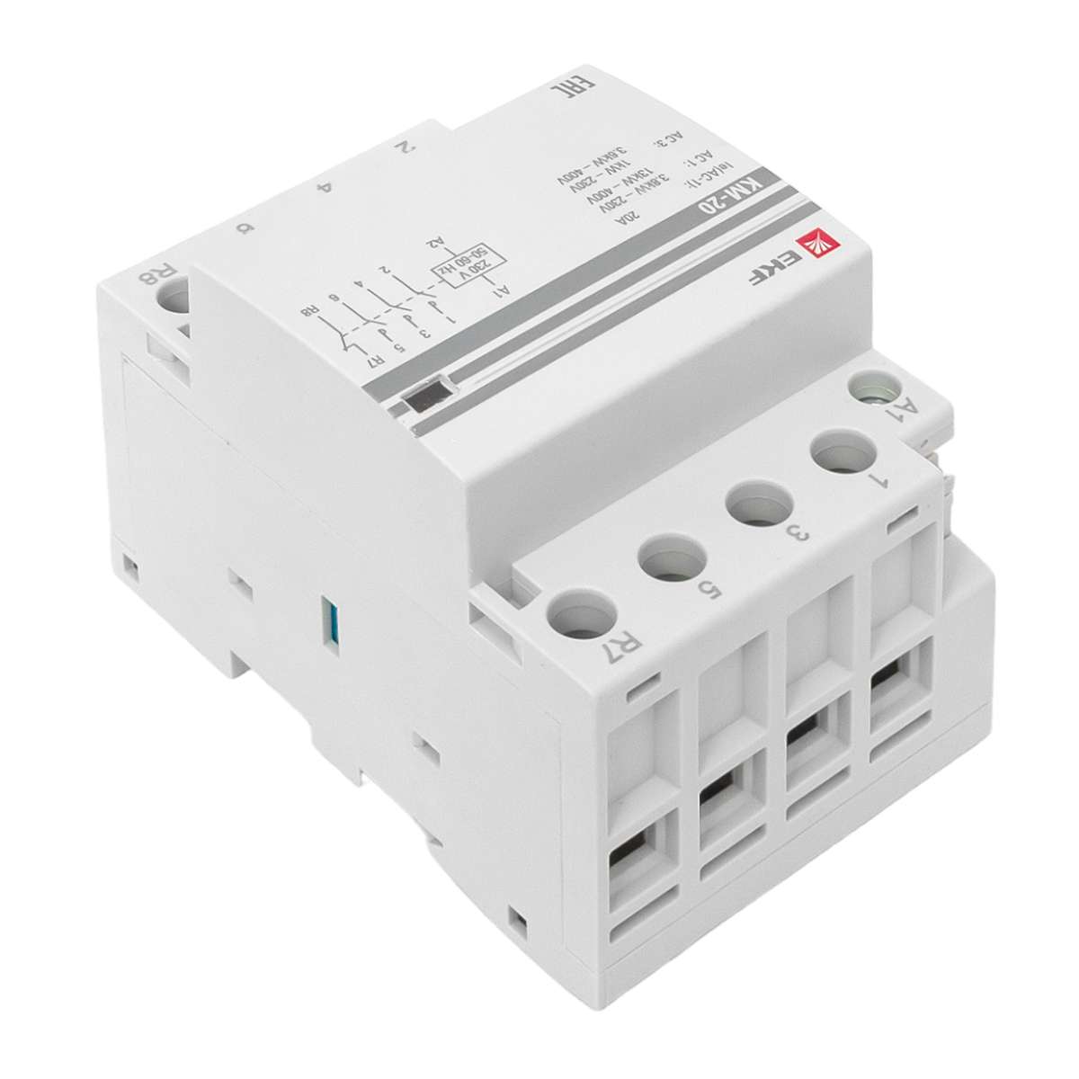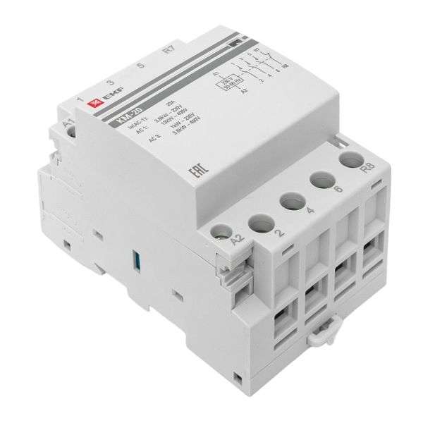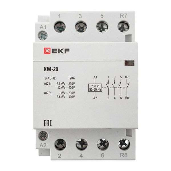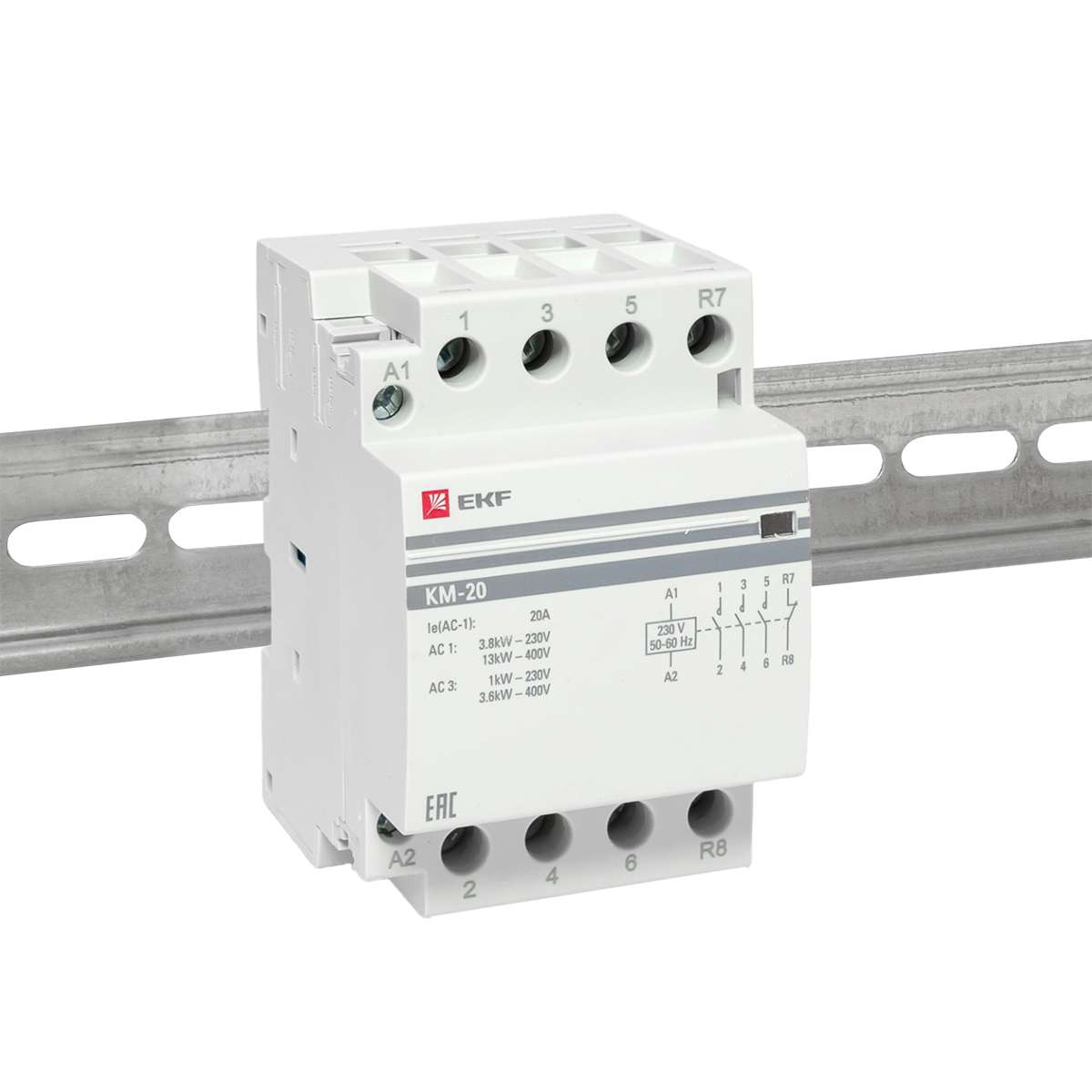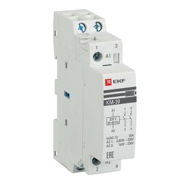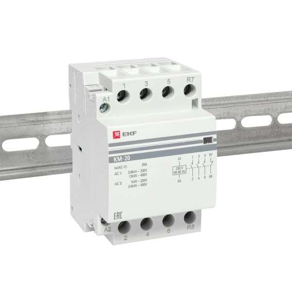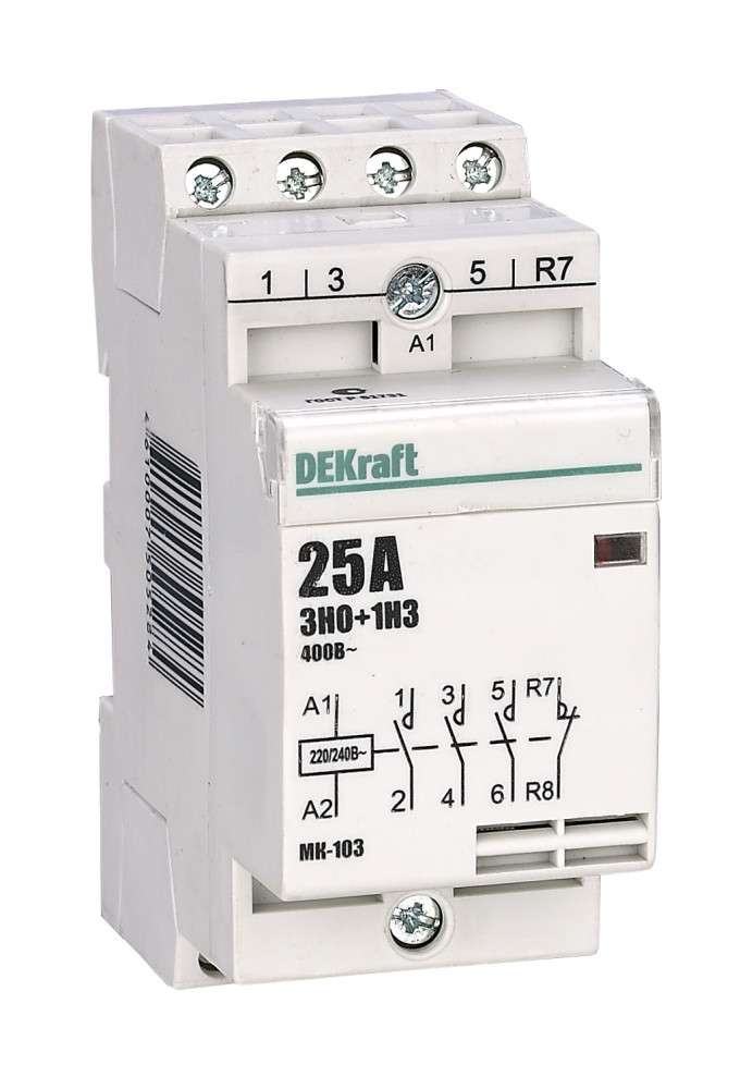 Модульные контакторы представляют из себя контактор в классическом корпусе модульного оборудования. Он состоит из неподвижных контактов, подвижных контактов, которые закреплены в подвижной части магнитной системы. Неподвижная часть магнитной системы закреплена жестко в корпусе КМ. Пружина препятствует смыканию контактов. При подаче напряжения на катушку управления в магнитной системе контактора возникает магнитное поле, которое, преодолевая сопротивление пружины, смыкает магнитную систему и замыкает контакты. При отключении напряжения с катушки управления пружина размыкает контакты. Возможна коммутация алюминиевым и медным проводом.
