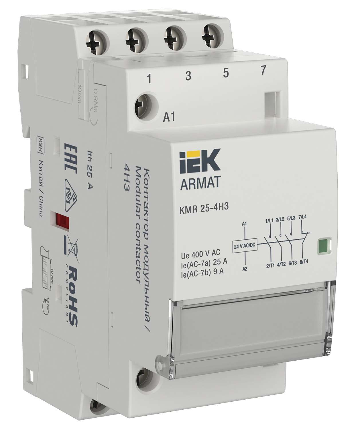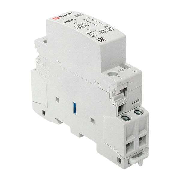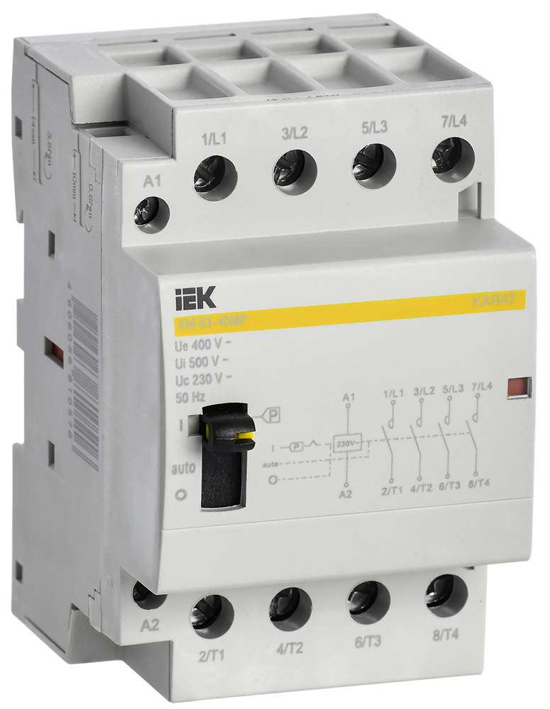 Модульные контакторы представляют из себя контактор в классическом корпусе модульного оборудования. Он состоит из неподвижных контактов, подвижных контактов, которые закреплены в подвижной части магнитной системы. Неподвижная часть магнитной системы закреплена жестко в корпусе КМ. Пружина препятствует смыканию контактов. При подаче напряжения на катушку управления в магнитной системе контактора возникает магнитное поле, которое, преодолевая сопротивление пружины, смыкает магнитную систему и замыкает контакты. При отключении напряжения с катушки управления пружина размыкает контакты. Возможна коммутация алюминиевым и медным проводом.