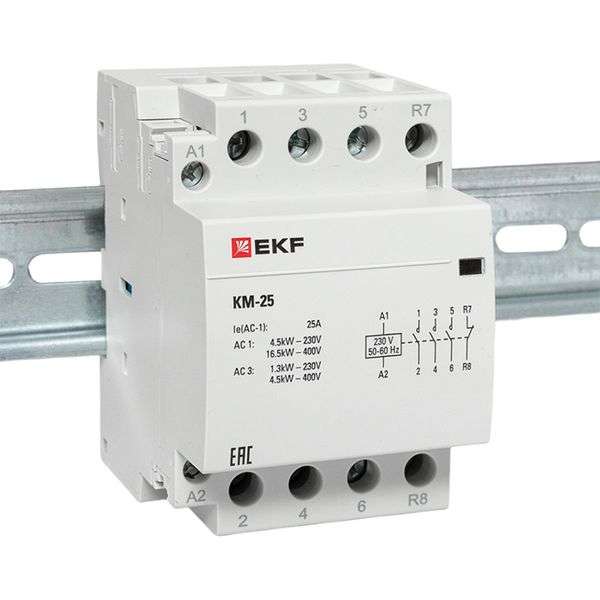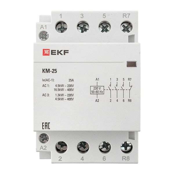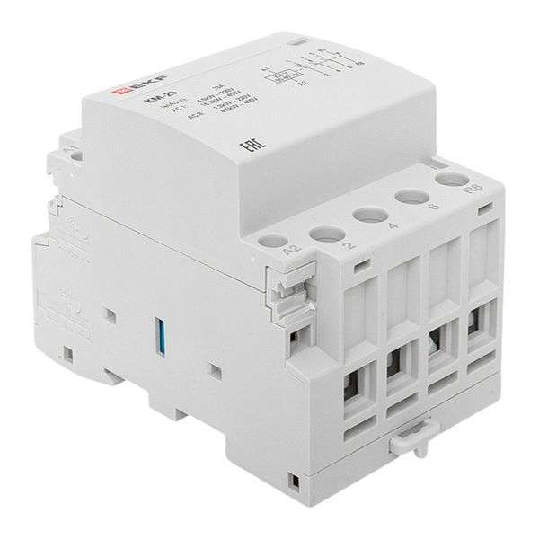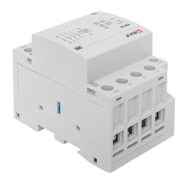 Модульные контакторы представляют из себя контактор в классическом корпусе модульного оборудования. Он состоит из неподвижных контактов, подвижных контактов, которые закреплены в подвижной части магнитной системы. Неподвижная часть магнитной системы закреплена жестко в корпусе КМ. Пружина препятствует смыканию контактов. При подаче напряжения на катушку управления в магнитной системе контактора возникает магнитное поле, которое, преодолевая сопротивление пружины, смыкает магнитную систему и замыкает контакты. При отключении напряжения с катушки управления пружина размыкает контакты. Возможна коммутация алюминиевым и медным проводом.