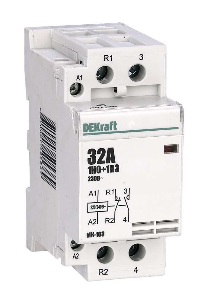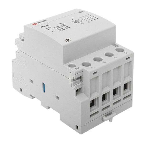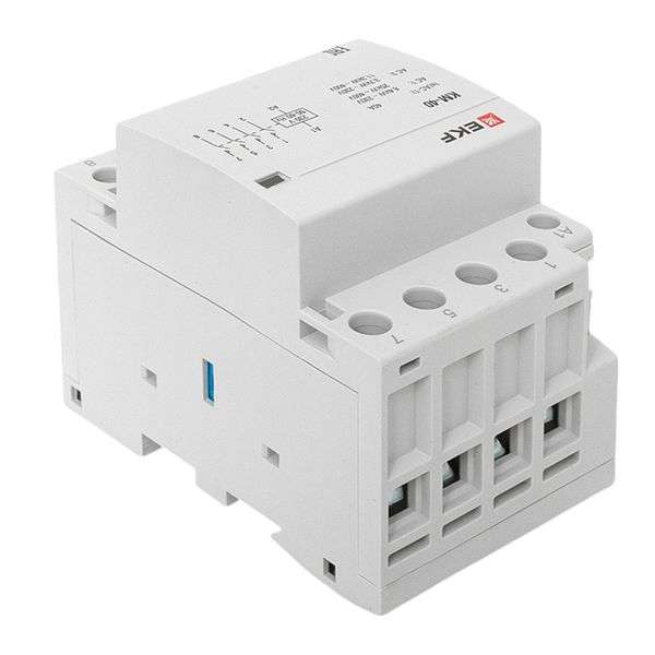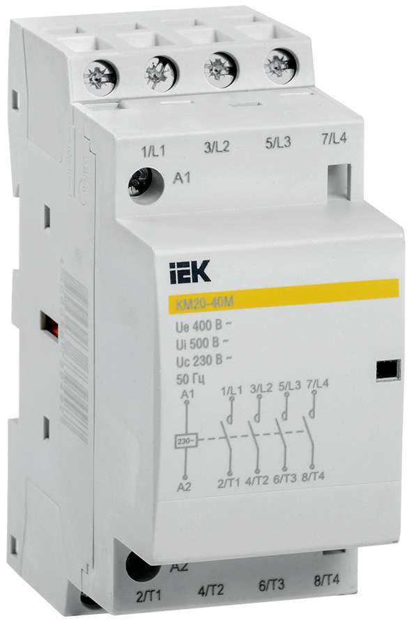 Модульные контакторы представляют из себя контактор в классическом корпусе модульного оборудования. Он состоит из неподвижных контактов, подвижных контактов, которые закреплены в подвижной части магнитной системы. Неподвижная часть магнитной системы закреплена жестко в корпусе КМ. Пружина препятствует смыканию контактов. При подаче напряжения на катушку управления в магнитной системе контактора возникает магнитное поле, которое, преодолевая сопротивление пружины, смыкает магнитную систему и замыкает контакты. При отключении напряжения с катушки управления пружина размыкает контакты. Возможна коммутация алюминиевым и медным проводом.