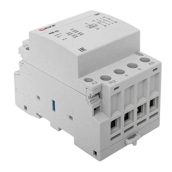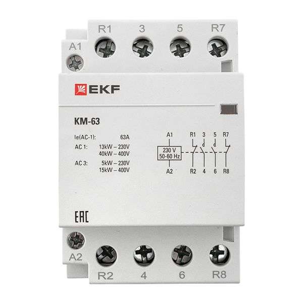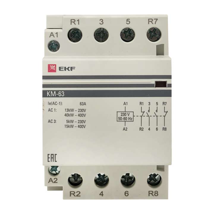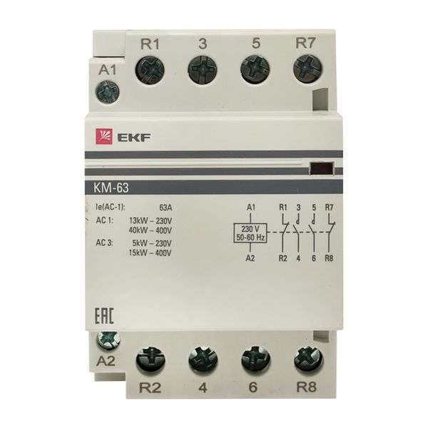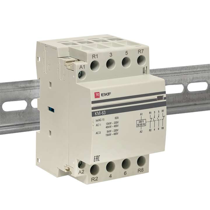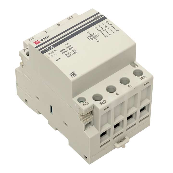 Модульные контакторы представляют из себя контактор в классическом корпусе модульного оборудования. Он состоит из неподвижных контактов, подвижных контактов, которые закреплены в подвижной части магнитной системы. Неподвижная часть магнитной системы закреплена жестко в корпусе КМ. Пружина препятствует смыканию контактов. При подаче напряжения на катушку управления в магнитной системе контактора возникает магнитное поле, которое, преодолевая сопротивление пружины, смыкает магнитную систему и замыкает контакты. При отключении напряжения с катушки управления пружина размыкает контакты. Возможна коммутация алюминиевым и медным проводом.