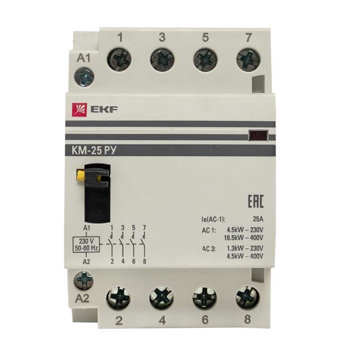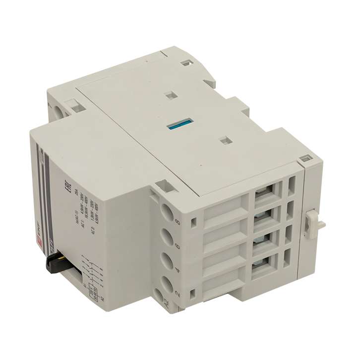 Модульные контакторы представляют из себя контактор в классическом корпусе модульного оборудования. Он состоит из неподвижных контактов, подвижных контактов, которые закреплены в подвижной части магнитной системы. Неподвижная часть магнитной системы закреплена жестко в корпусе КМ. Пружина препятствует смыканию контактов. При подаче напряжения на катушку управления в магнитной системе контактора возникает магнитное поле, которое, преодолевая сопротивление пружины, смыкает магнитную систему и замыкает контакты. При отключении напряжения с катушки управления пружина размыкает контакты. Возможна коммутация алюминиевым и медным проводом.