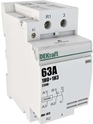 Модульный контактор серии МК-103 Dekraft; ном.ток 40 А (АС-7а); кол-во и исполнение контактов – 1НО+1НЗ; напряжение управления 220 В пер.тока; ширина – 2 мод. х 18 мм; установка – на DIN-рейку. Контакторы МК-103 применяются в сетях напряжением до 400 В пер.тока для дистанционного управления небольшими нагрузками, требующими большого количества включений / отключений, например, насосы, системы вентиляции и т.п. Модульные контакторы не требуют дополнительных настроек и специального обслуживания.