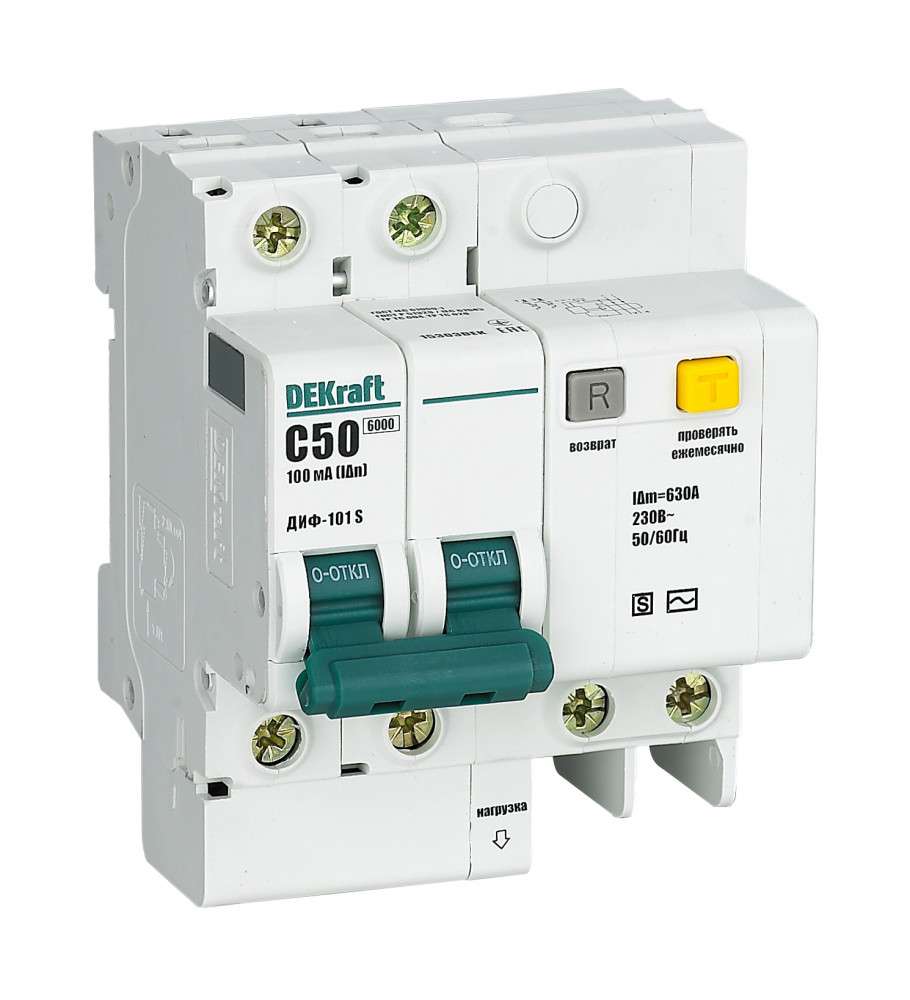 Автоматический выключатель дифференциального тока серии ДИФ-103 DEKraft; 1P+N; ном.ток 16 А; характеристика C; откл.способность Icn = 6 kA; ток утечки 10 мА; тип - АС; блок дифф.защиты and ndash; электронный; ширина and ndash; 2 мод. х 18 мм; монтаж and ndash; на DIN-рейку. АВДТ применяются в сетях напряжением до 220 В пер.тока для защиты человека от поражения электрическим током и электроустановок от сверхтоков и токов утечки. Аппараты ДИФ-103 являются более компактным вариантом АВДТ по сравнению с серией ДИФ-101.
