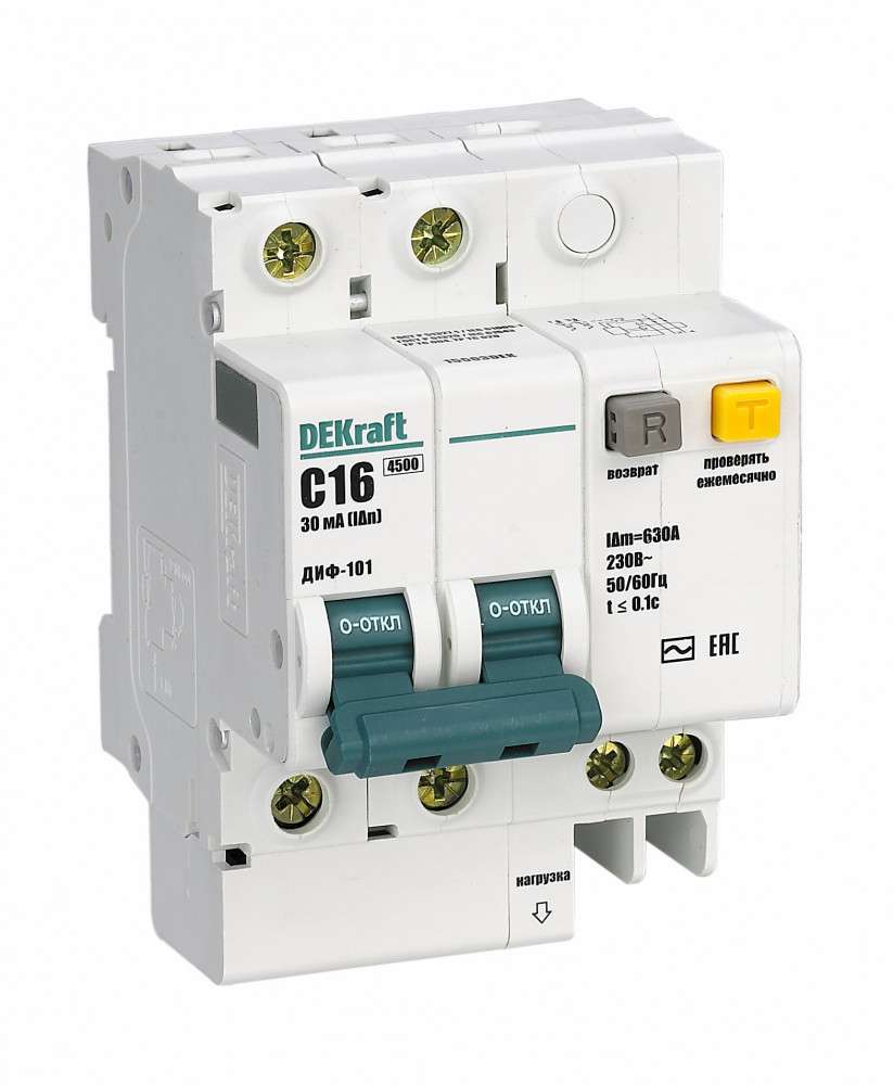 Автоматический выключатель дифференциального тока серии ДИФ-103 Dekraft; 1P+N; ном.ток 25 А; характеристика C; откл.способность Icn = 6 kA; ток утечки 10 мА; тип - АС; блок дифф.защиты – электронный; ширина – 2 мод. х 18 мм; монтаж – на DIN-рейку. АВДТ применяются в сетях напряжением до 220 В пер.тока для защиты человека от поражения электрическим током и электроустановок от сверхтоков и токов утечки. Аппараты ДИФ-103 являются более компактным вариантом АВДТ по сравнению с серией ДИФ-101.