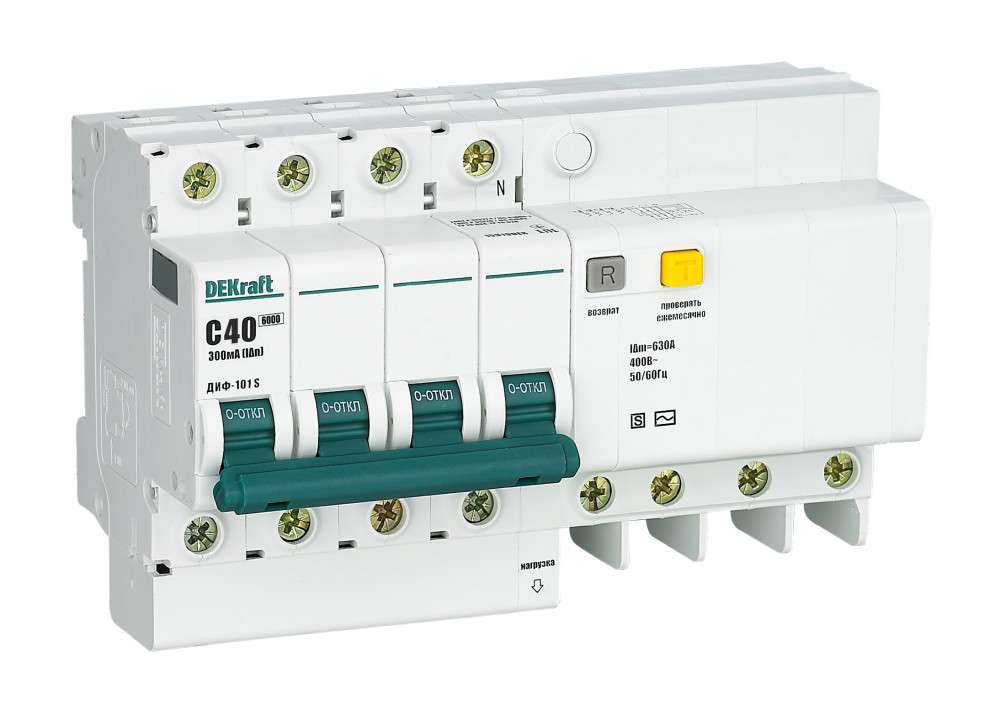 Автоматический выключатель дифференциального тока серии ДИФ-101 S Dekraft; селективный; 4P; ном.ток 40 А; характеристика C; откл.способность Icn = 6 кА; ток утечки 300 мА; блок дифф.защиты – электронный; ширина – 8 мод. х 18 мм; монтаж – на DIN-рейку. АВДТ применяются в сетях напряжением до 400 В пер.тока для защиты электроустановок от сверхтоков и токов утечки; в щитах, где требуется ступенчатая дифференциальная защита (задержка по срабатыванию).