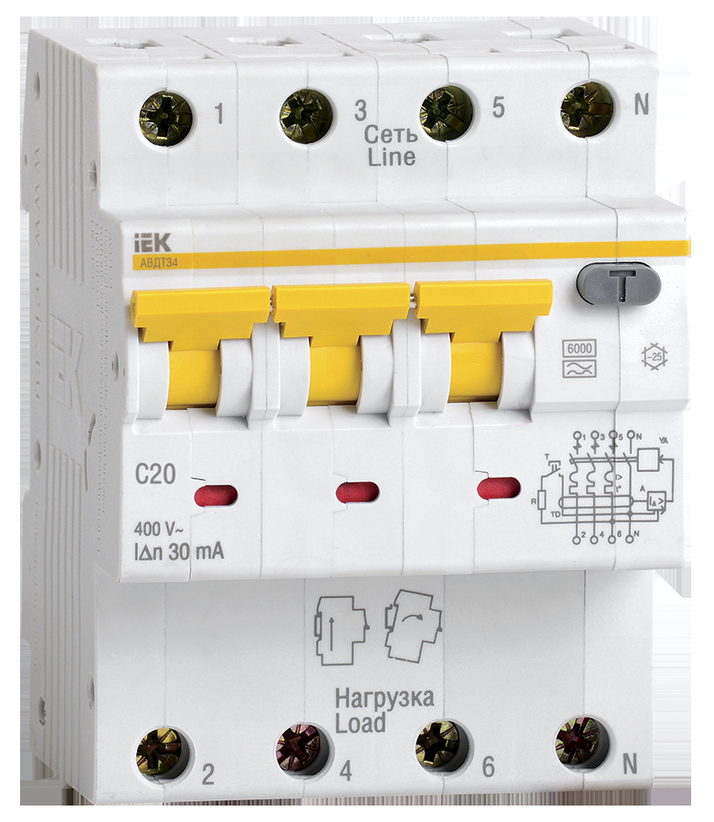 Автоматические выключатели дифференциального тока АВДТ34 предназначены для защиты человека от поражения электрическим током при повреждении изоляции электроустановок, для предотвращения пожаров вследствие протекания токов утечки на землю и для защиты от перегрузки и короткого замыкания в сетях переменного тока напряжением 400 В и частотой 50 Гц. АВДТ34 со встроенной защитой от сверхтоков реагируют не только на синусоидальные переменные дифференциальные токи, но и на пульсирующие постоянные дифференциальные токи. Источником пульсирующего тока являются, например, стиральные машины с регуляторами скорости, регулируемые источники света, телевизоры, видеомагнитофоны, персональные компьютеры и др. АВДТ34 выпускаются в четырехполюсном исполнении на номинальные токи 6, 10, 16, 20, 25, 32, 40, 50, 63 А и номинальные отключающие дифференциальные токи 10, 30, 100, 300 мА.