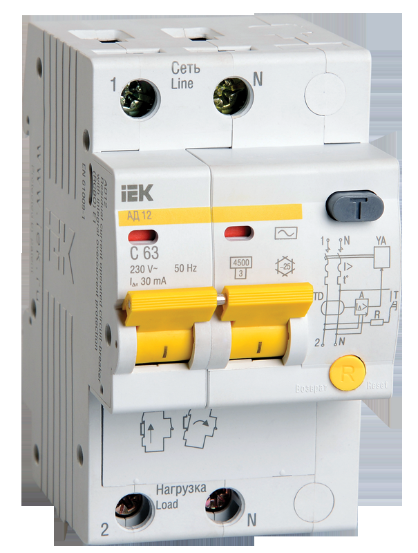 Быстродействующие защитные выключатели обеспечивают: – в исполнениях с уставками срабатывания 10, 30 и 100 мА – защиту людей от поражения электрическим током при прямом непреднамеренном прикосновении к токоведущим частям электрооборудования; – в исполнении с уставкой срабатывания 300 мА – защиту от пожара из-за возгорания изоляции токоведущих частей; – защиту от перегрузки и короткого замыкания; – защиту от недопустимого повышения напряжения сети (АД12М). В изделиях предусмотрена индикация срабатывания от дифференциального тока, а для АД12М также светодиодная индикация включенного состояния. АД12М сохраняет работоспособность при снижении напряжения электрической сети до 110 В. В качестве коммутационных аппаратов в изделиях использованы выключатели автоматические ВА47-29 новой серии.