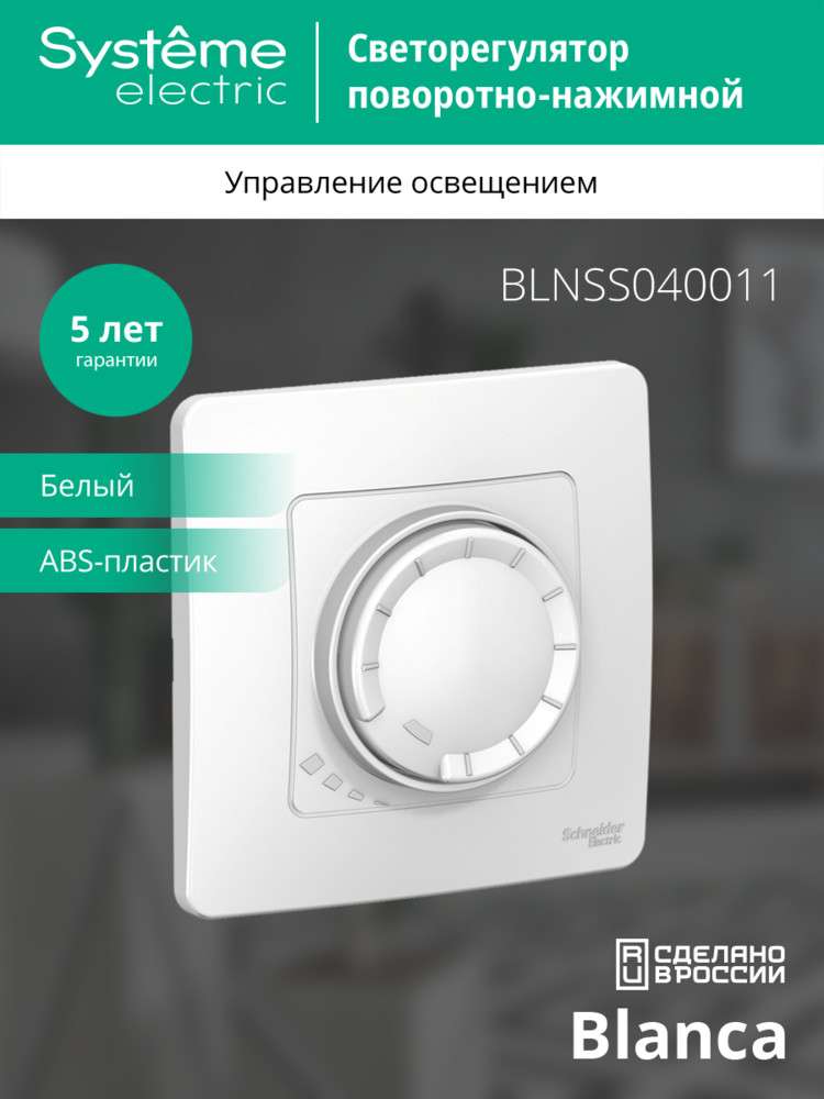 Светорегулятор (диммер) Systeme Electric (ранее Schneider Electric) BLANCA (белый, скрытой установки) поворотно-нажимной универсальный предназначен для сетей 230В, потребление 5-150Вт для светодиодных ламп и 10-400Вт для ламп накаливания и галогенных. Диммер изготовлен из ABS-пластика, прост в установке и удобен в применении.