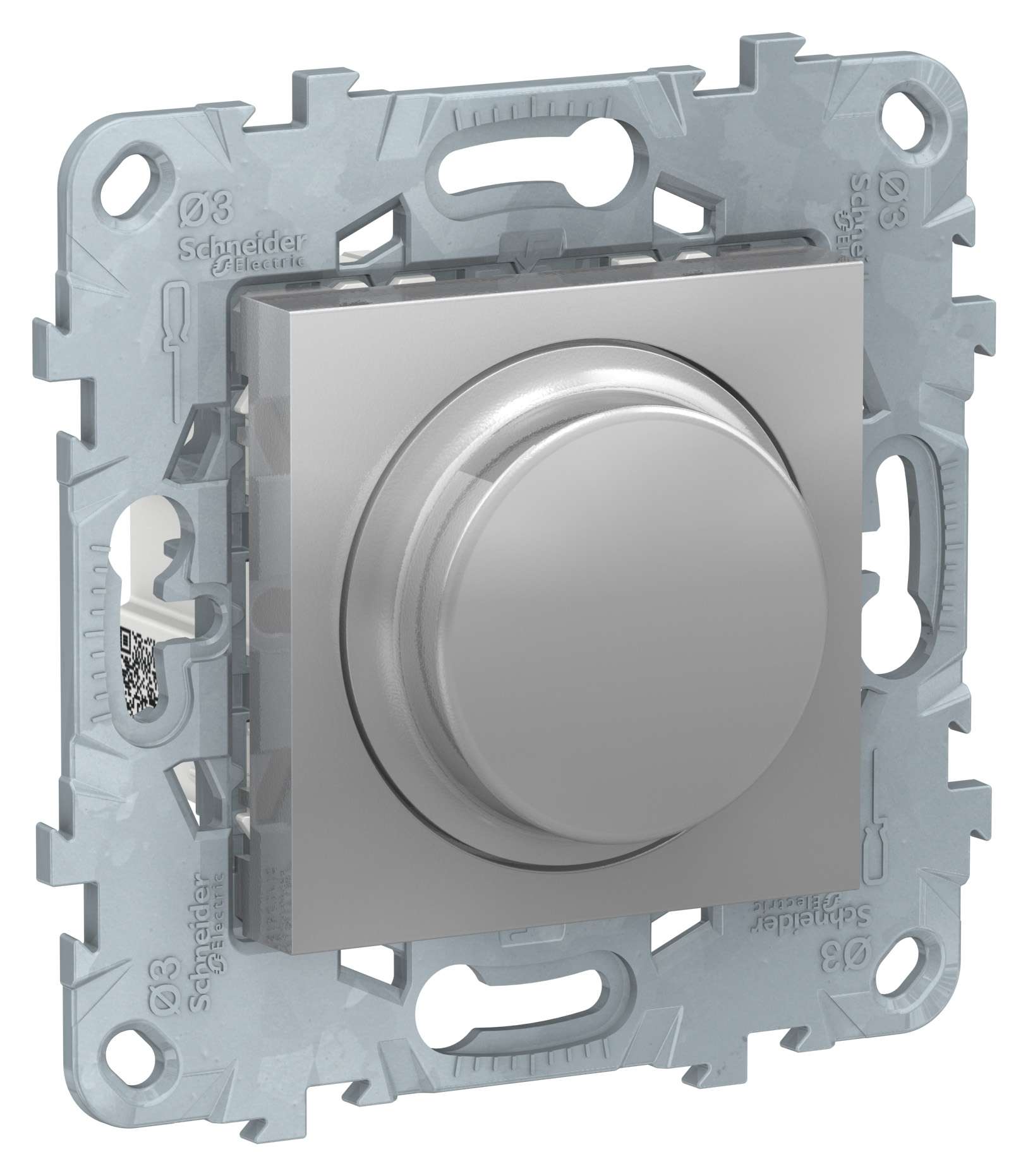 Светорегулятор Schneider Electric UNICA (алюминий) поворотно-нажимной универсальный с винтовыми зажимами на мощность 5-200 Вт. - Дистанционное управление с помощью неограниченного количества вспомогательных кнопочных выключателей. - Автоматическое определение нагрузки. - Подключение без нейтрали. - Функция памяти. - Автоматическая защита от перегрузки, перегрева, короткого замыкания.