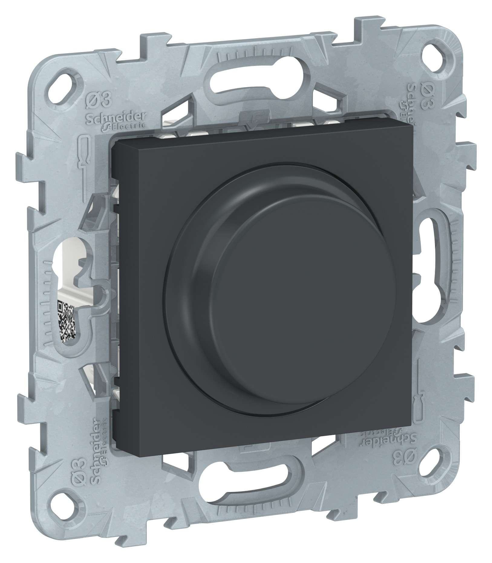 Светорегулятор Schneider Electric UNICA (антрацит) поворотно-нажимной универсальный с винтовыми зажимами на мощность 5-200 Вт. - Дистанционное управление с помощью неограниченного количества вспомогательных кнопочных выключателей. - Автоматическое определение нагрузки. - Подключение без нейтрали. - Функция памяти. - Автоматическая защита от перегрузки, перегрева, короткого замыкания.