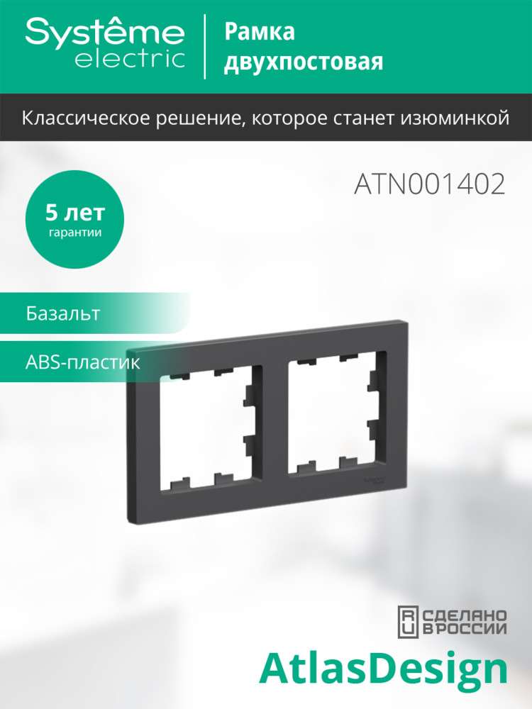Рамка Systeme Electric (ранее Schneider Electric) серии AtlasDesign в цвете БАЗАЛЬТ двухместная. - Устанавливается в вертикальном и горизонтальном положениях. - Лицевые детали из качественного ABS-пластика, устойчивого к царапинам и УФ-излучению. - Позволяет гармонично вписать электроустановочное изделие в интерьер помещения.