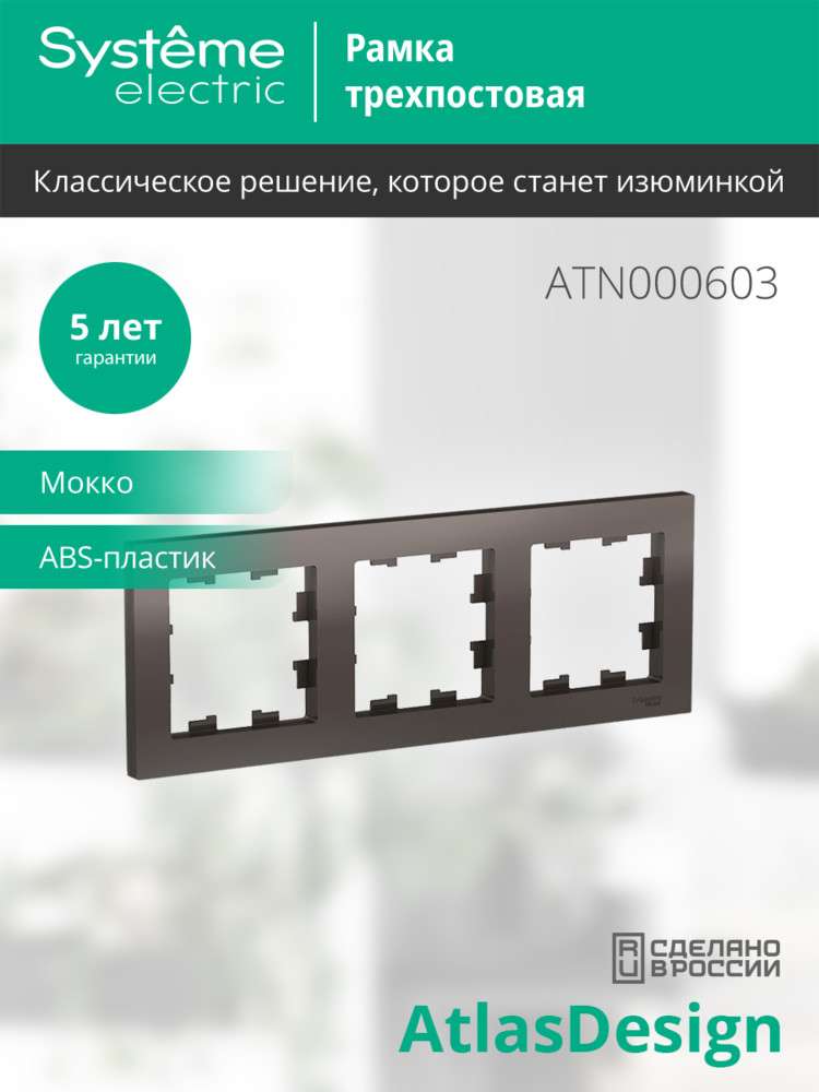 Рамка Systeme Electric (ранее Schneider Electric) серии AtlasDesign в цвете мокко трёхместная. - Устанавливается в вертикальном и горизонтальном положениях. - Лицевые детали из качественного ABS-пластика, устойчивого к царапинам и УФ-излучению. - Позволяет гармонично вписать электроустановочное изделие в интерьер помещения.