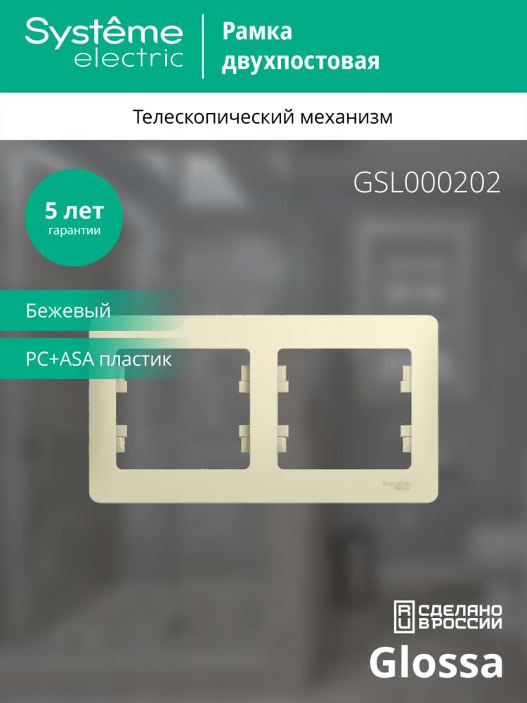 Рамка Systeme Electric (ранее Schneider Electric) серии Glossa (цвет бежевый) двухместная. - Устанавливается в горизонтальном положении. - Выполнена из материала PС+ASA, стойкого к УФ-излучению и появлению царапин. - Позволяет гармонично вписать электроустановочное изделие в интерьер помещения.