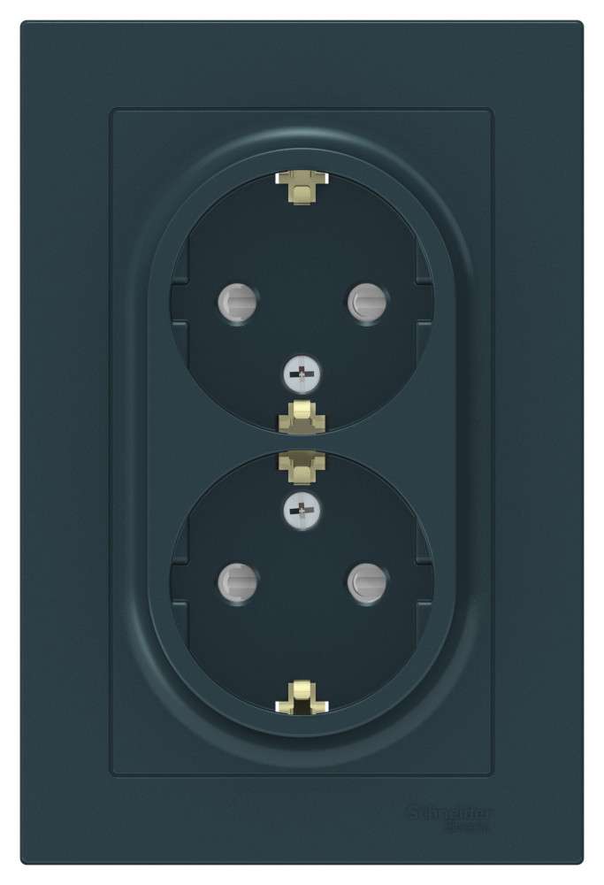 Розетка двойная Systeme Electric (ранее Schneider Electric) серии AtlasDesign (в сборе, цвет изумруд) с заземлением и шторками подходит для сетей 250 В, на ток 16 А. - Заземляющий контакт обеспечивает дополнительную защиту от удара электрическим током. - Лицевые детали из качественного ABS-пластика, устойчивого к царапинам и УФ-излучению. - Двойная розетка позволяет подключить два устройства в одном месте. - Изделие поставляется в комплекте с рамкой того же цвета.
