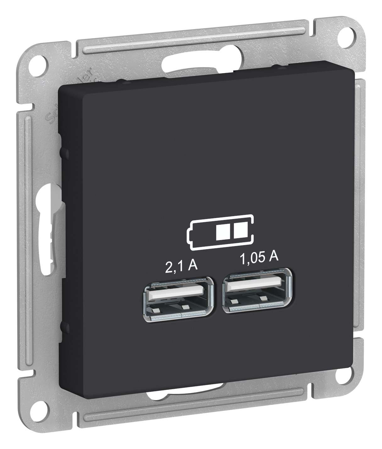 Механизм Systeme Electric (ранее Schneider Electric) серии AtlasDesign в цвете карбон розетки для зарядки с двумя разъёмами USB с выходными напряжением 5 В постоянного тока и выходами с номинальным током по 2,1 А. - USB розетка позволяет напрямую заряжать одно или два мобильных устройства. - Лицевые детали из качественного ABS-пластика, устойчивого к царапинам и УФ-излучению. - Благодаря покрытию «soft touch» к изделию приятно прикасаться.