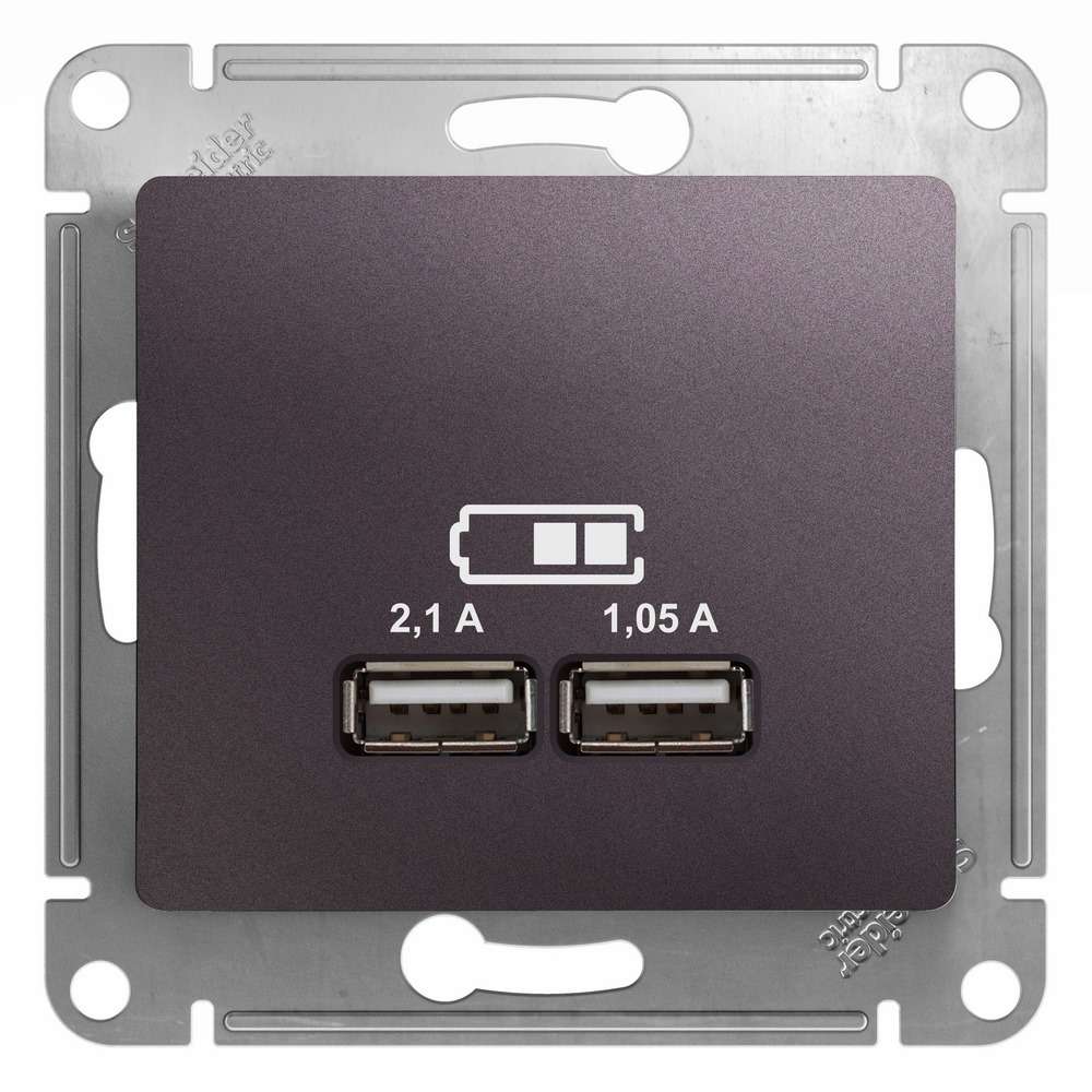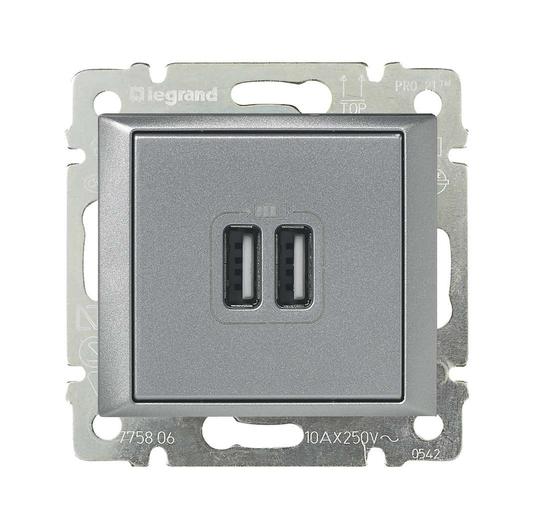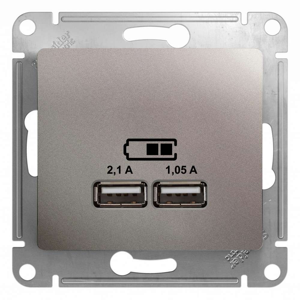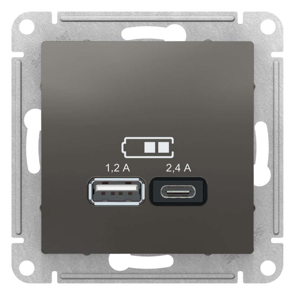 Розетка Systeme Electric (ранее Schneider Electric) серии AtlasDesign в цвете сталь двойная USB с разъемами типа A+C - Лицевые детали из качественного ABS-пластика, устойчивого к царапинам и УФ-излучению. - Самая современная USB-зарядка с двумя разъемами позволяет заряжать как стандартные мобильные устройства через разъем типа А, так и новейшие устройства, в том числе ноутбуки, с разъемом типа С.