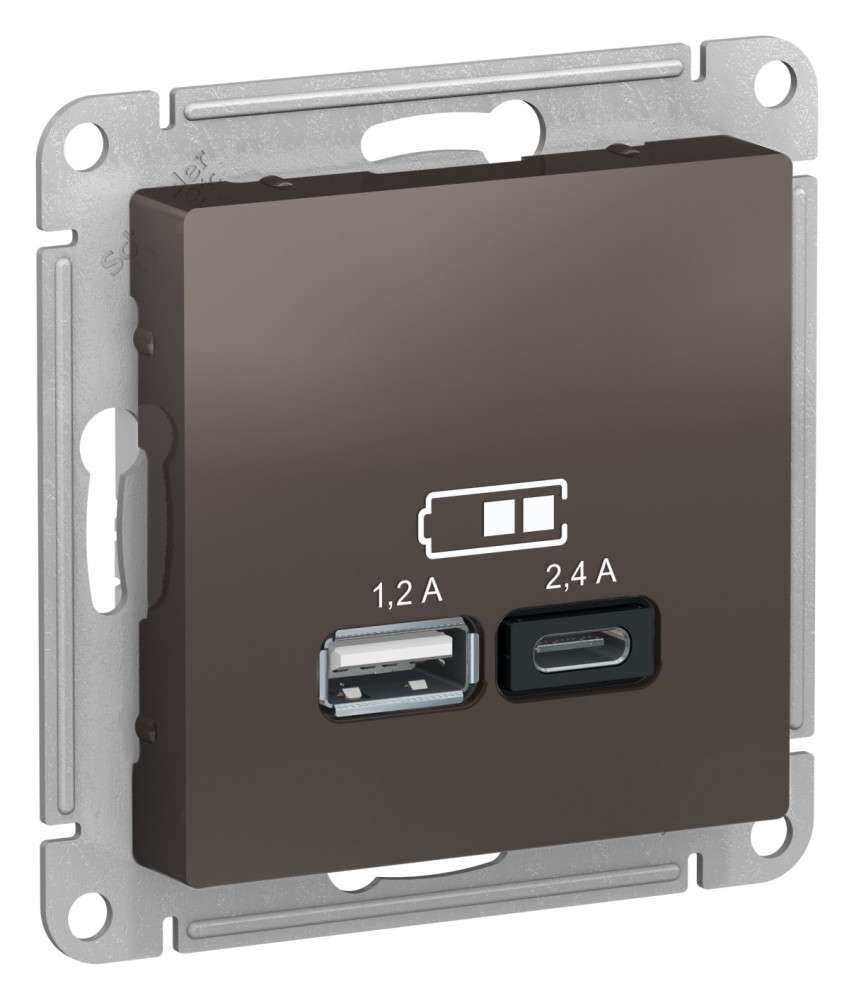 Розетка Systeme Electric (ранее Schneider Electric) серии AtlasDesign в цвете мокко двойная USB с разъемами типа A+C - Лицевые детали из качественного ABS-пластика, устойчивого к царапинам и УФ-излучению. - Самая современная USB-зарядка с двумя разъемами позволяет заряжать как стандартные мобильные устройства через разъем типа А, так и новейшие устройства, в том числе ноутбуки, с разъемом типа С.