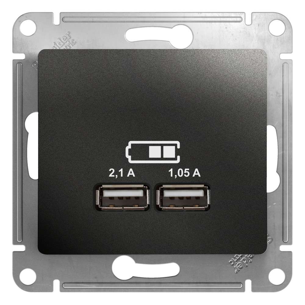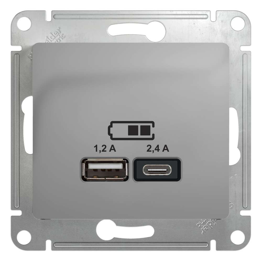 Розетка Systeme Electric (ранее Schneider Electric) серии Glossa (цвет алюминий) двойная USB с разъемами типа A+C. - Выполнена из материала PС+ASA, стойкого к УФ-излучению и появлению царапин. - Самая современная USB-зарядка с двумя разъемами позволяет заряжать как стандартные мобильные устройства через разъем типа А, так и новейшии устройства, в том числе ноутбуки, с разъемом типа С.